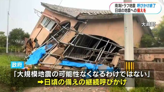 日向灘地震から1週間 南海トラフ臨時情報の呼びかけ終了 鹿児島 2024年8月15日(木) 20:06 国内 今月8日の日向灘での地震を受けて南海トラフ地震臨時情報の「巨大地震注意」が発表されてから、きょう15日で1週間です。政府は15日午後5時に警戒度の高い防災対応の呼びかけを終了しました。(松村祥史・防災担当…