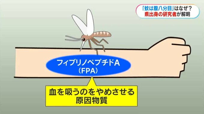 それが、今回、人の血液中に存在し、血を固める際に発生するフィブリノペプチドA=FPAが、血を吸うのをやめさせる原因物質だと突き止めたのです。他の種類の蚊にも同じことが言える可能性があるといいます。