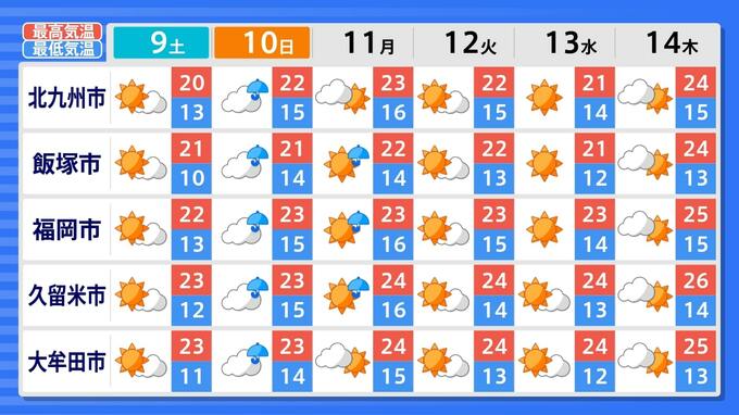 【九州の天気】きょう立冬なのに来週は夏日!?【福岡・佐賀・長崎・大分・熊本・宮崎・鹿児島】14日(木)までの天気予報 2024年11月7日(木) 17:28 国内 天気 福岡県の詳しい予報 7日(木)朝は、糸島市以外のアメダス観測地点で今シーズン最低の気温を更新し、福岡市博多区9.9℃、北九州市八幡西区9.4℃と今季初めて10℃を下回りました。県内で最も下がったのは八女市黒木町の6.3℃。です。 7日(木)朝の最低気温は12.5℃でした 7日(木)朝の最低気温は11.3℃でした 14日(木)福岡市・久留米市・大牟田市では夏日の予想