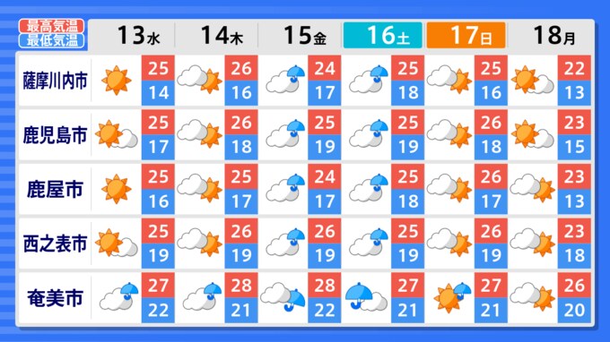 【今週の九州天気】夏日続出 季節逆戻り【福岡・佐賀・長崎・大分・熊本・宮崎・鹿児島】18日(月)までの予報 2024年11月11日(月) 20:03 国内 天気 鹿児島県の詳しい予報 【鹿児島市を例に】今週の気温傾向をみると、きょう11日(月)は1週間ぶりの夏日となりましたが、明日以降も毎日夏日となりそうです。 12日(火)鹿児島県の天気予報 鹿児島県の週間予報