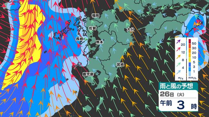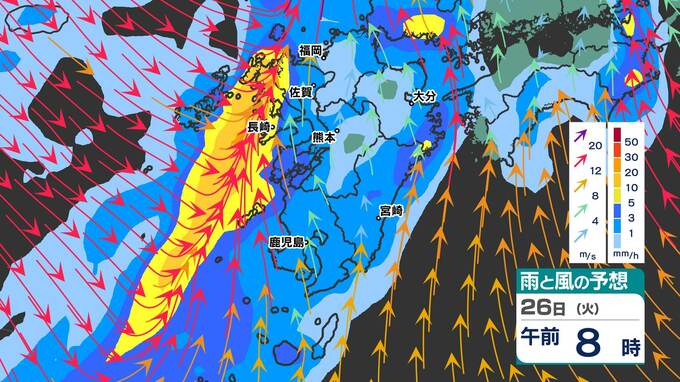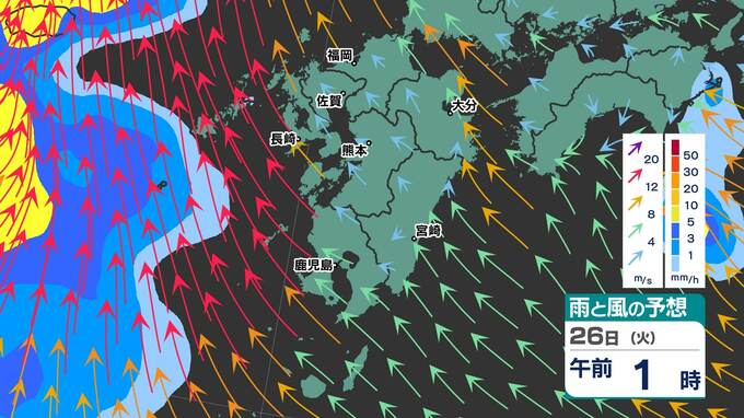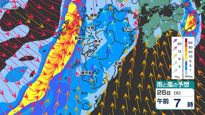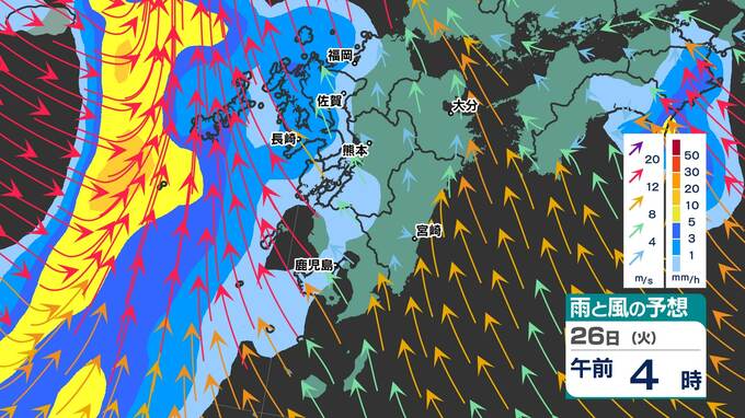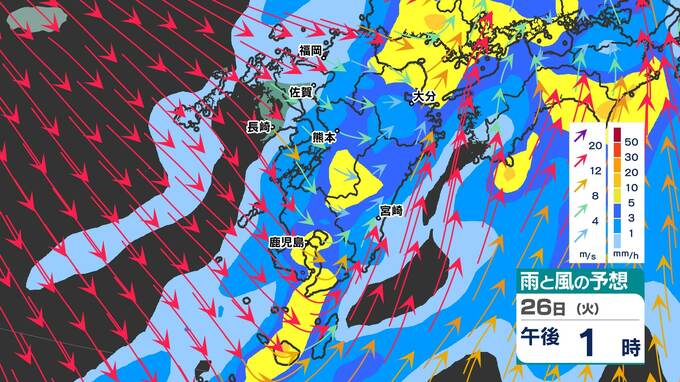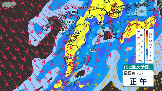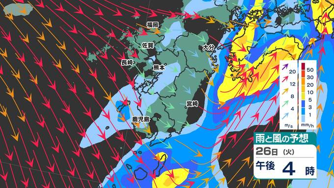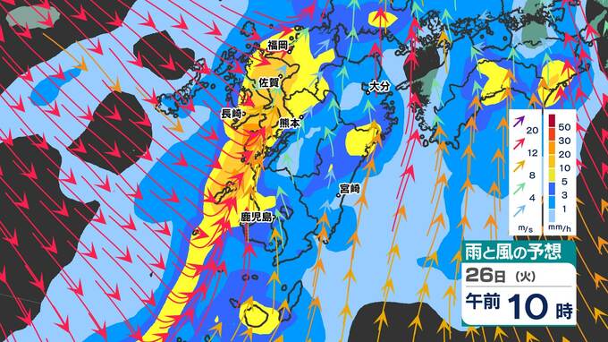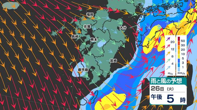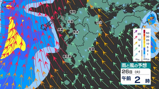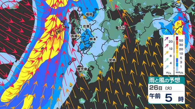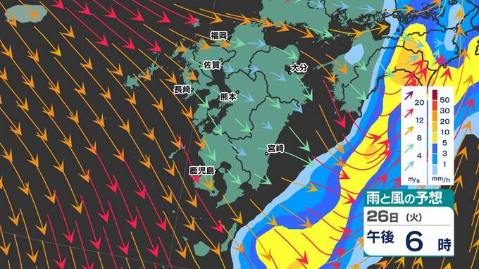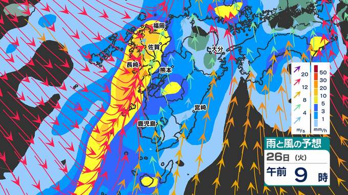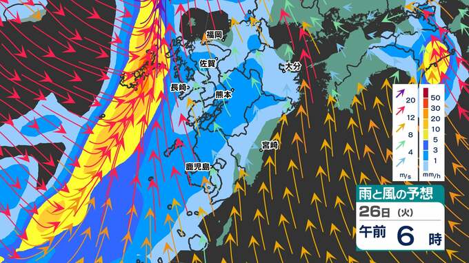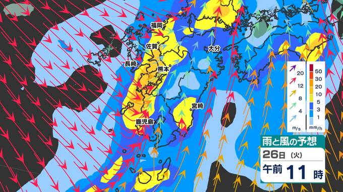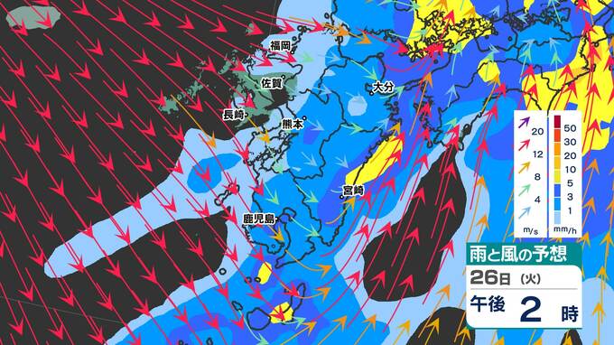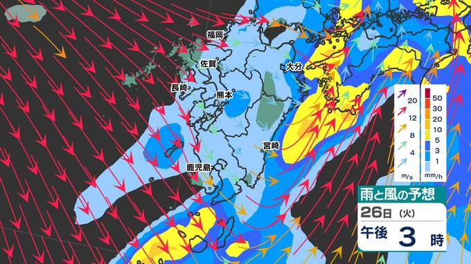 【九州の天気予報】あす26日(火)荒れた天気 暴風警報発表か? 【福岡・佐賀・長崎・大分・熊本・宮崎・鹿児島】26日(火)雨と風のシミュレーション 2024年11月25日(月) 20:32 国内 天気 26日(火)雨+風のシミュレーション 雨の予想に「風」の予想を加えて見てみましょう。活発な雨雲が通過するタイミングで、異なる風向きの「風」がぶつかり、さらに強まる様子をごらんください。『竜巻注意情報』が発表される可能性があります。