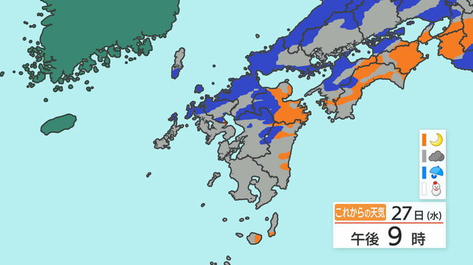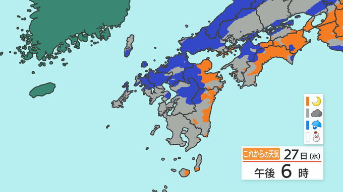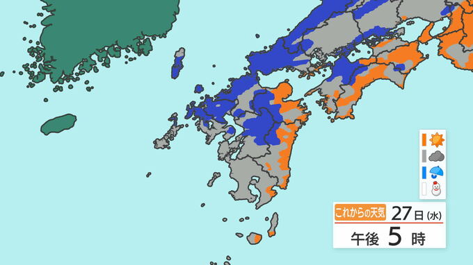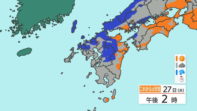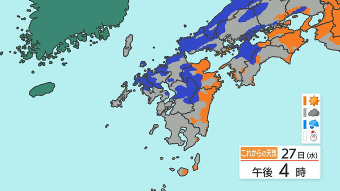 【九州の天気予報】寒気流入 変わりやすい天気【福岡・佐賀・長崎・大分・熊本・宮崎・鹿児島】雨のシミュレーション&メッシュ予報 2024年11月27日(水) 13:22 国内 天気 メッシュ予報 青が雨、グレーがくもり、オレンジが晴れを表しています。九州北部は全般に雨。九州南部はくもり。九州山地で雨雲が遮られる九州東部は晴れそうです。