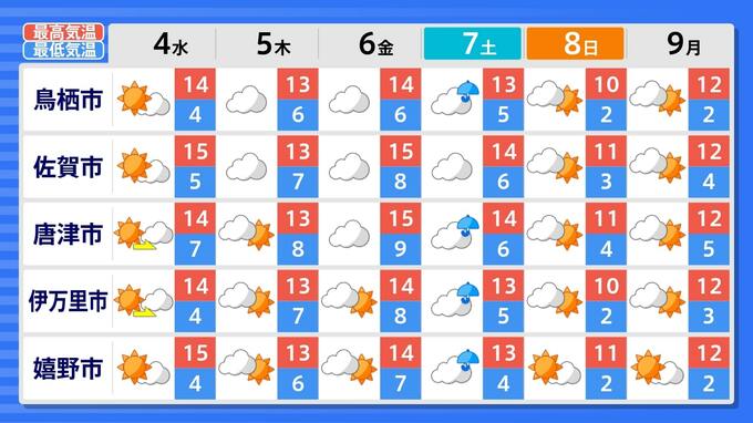 【九州の天気予報】きょう3日(火)”暖かい”が、次の日曜は”寒い” 【福岡・佐賀・長崎・大分・熊本・宮崎・鹿児島】 2024年12月3日(火) 11:08 国内 天気 各地の週間予報 7日(土)8日(日)は天気・気温とも予報が変わる可能性がありますので、今後の情報に注意してください。具体的には《最高気温でもひとケタ》《九州北部は雪の予報》に変更されるかもしれません。