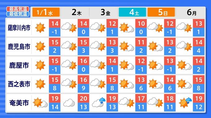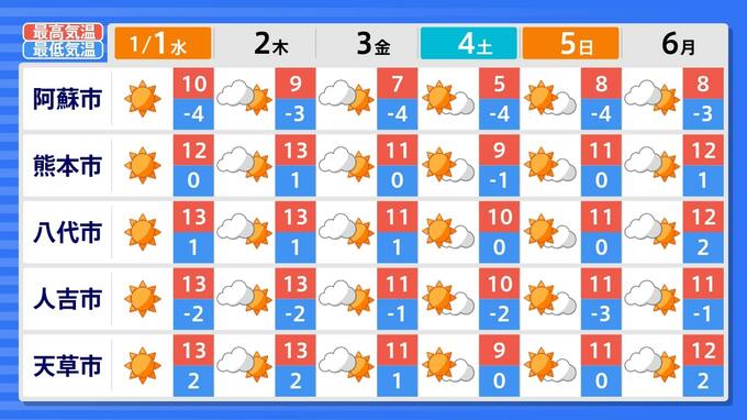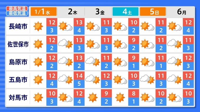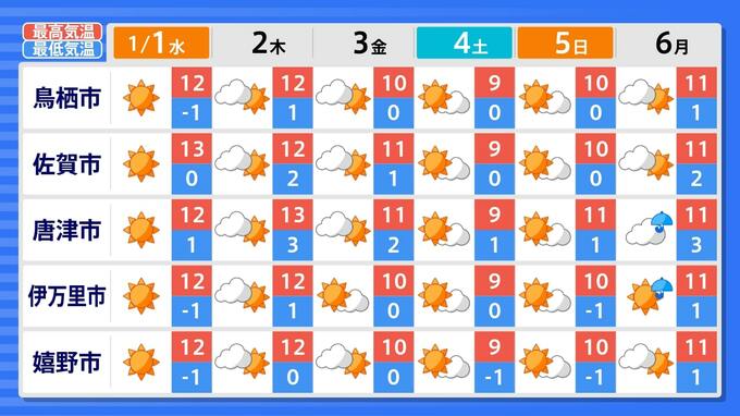【九州の天気予報】大みそか・元日・初日の出・お正月の天気は?【福岡・佐賀・長崎・大分・熊本・宮崎・鹿児島】 2024年12月30日(月) 13:20 国内 天気 週間予報(元日~6日) 画像で確認できます。4日(土)・5日(日)は寒気が強まるため、九州だけでなく全国的に寒さが厳しくなるでしょう。