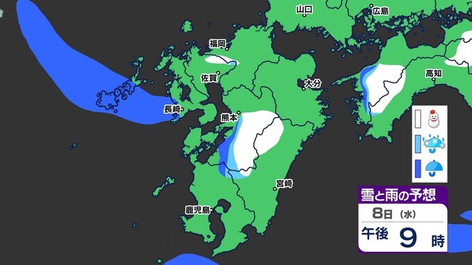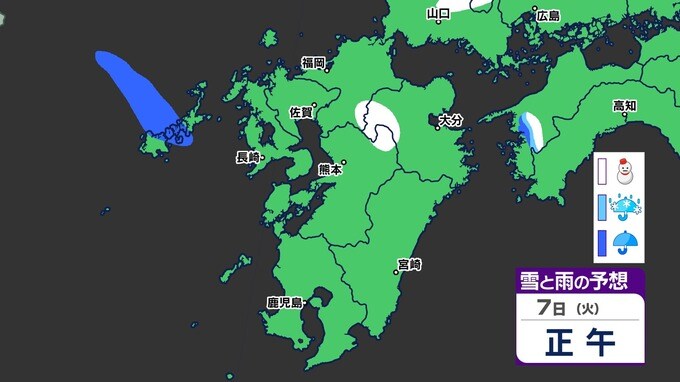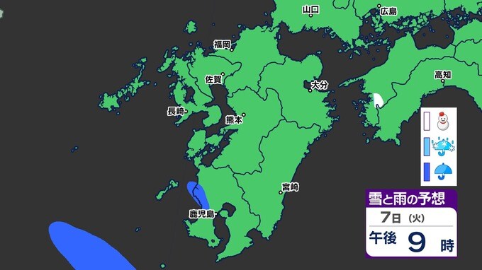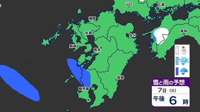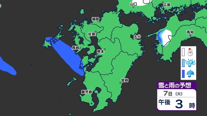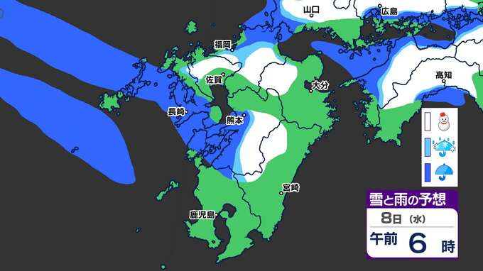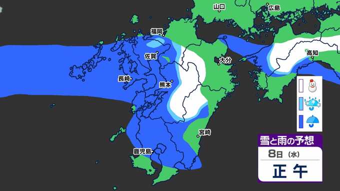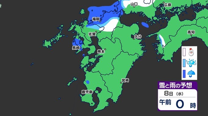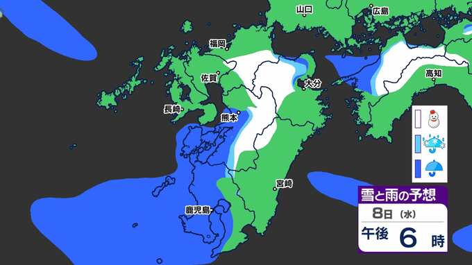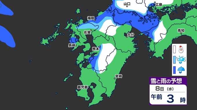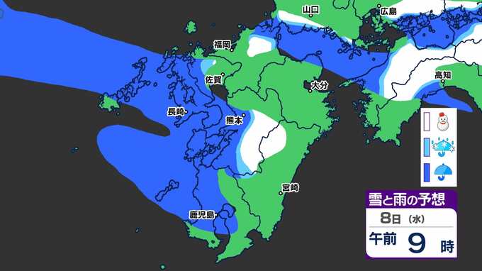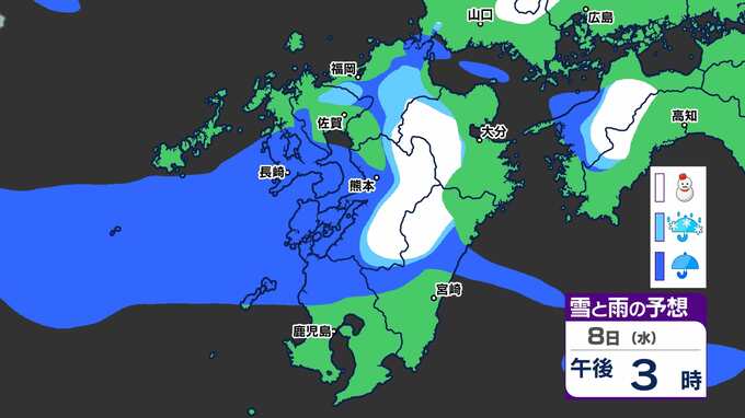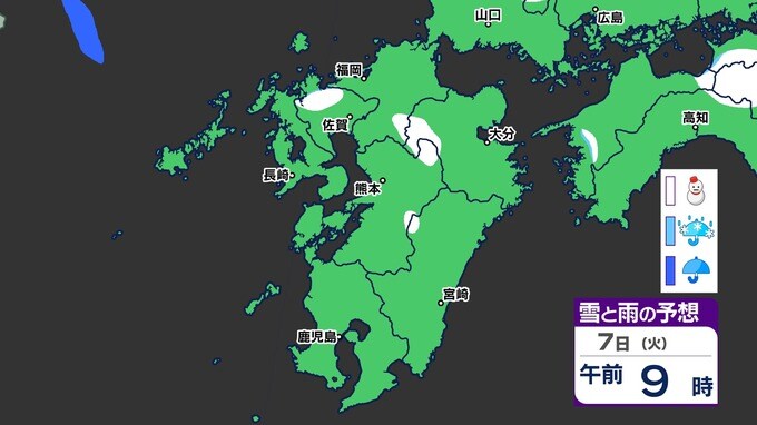 【九州の天気予報】来週は”年明け寒波”がやってくる【福岡・佐賀・長崎・大分・熊本・宮崎・鹿児島】雨と雪のシミュレーション 2025年1月3日(金) 16:00 国内 天気 7日(火)~8日(水)雨と雪のシミュレーション 7日(火)は標高の高い所が雪の予想ですが、8日(水)になると平地でも雪が予想されています。 『白』=『雪』/『水色』=『みぞれ(雨と雪が混ざったもの)』/『青』=『雨』の予想です。