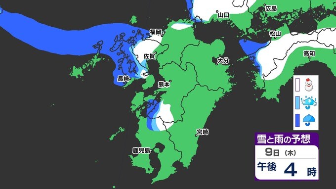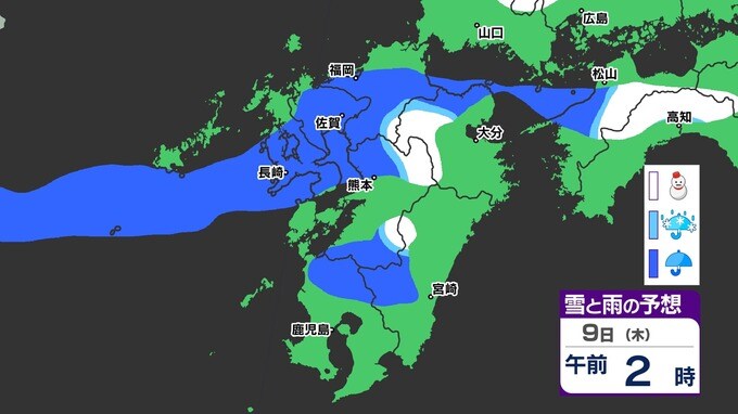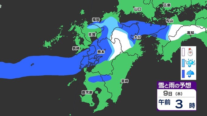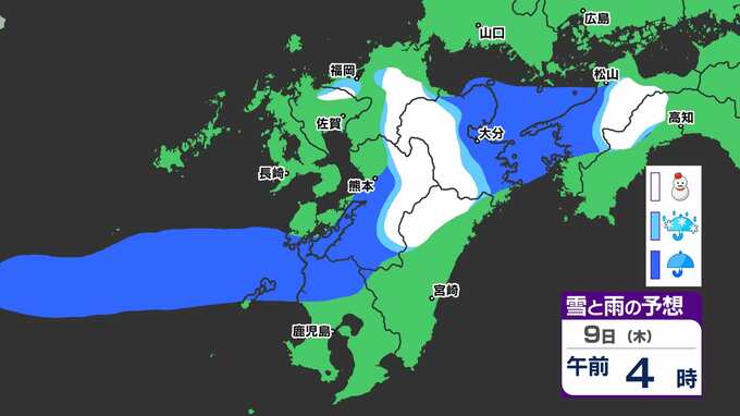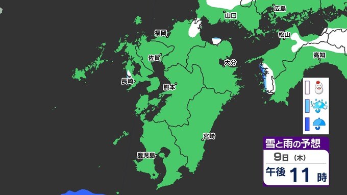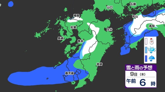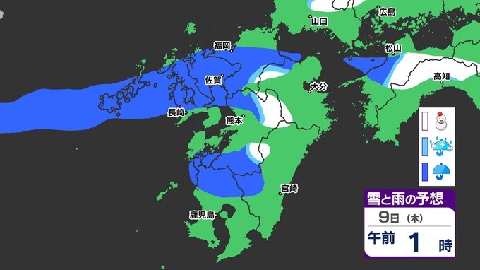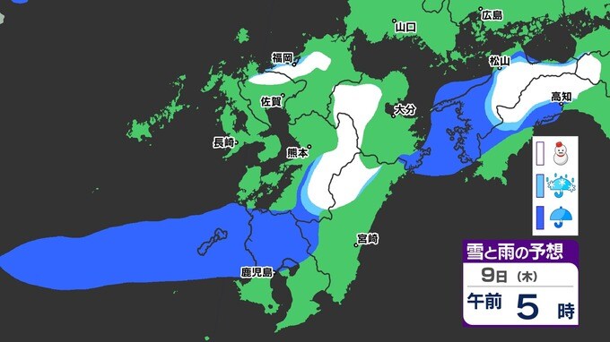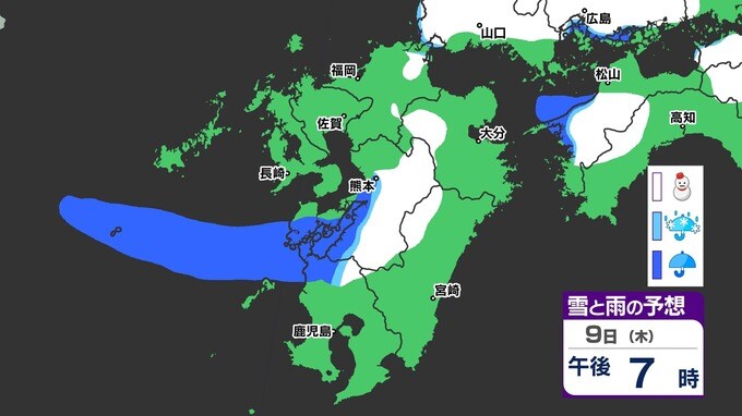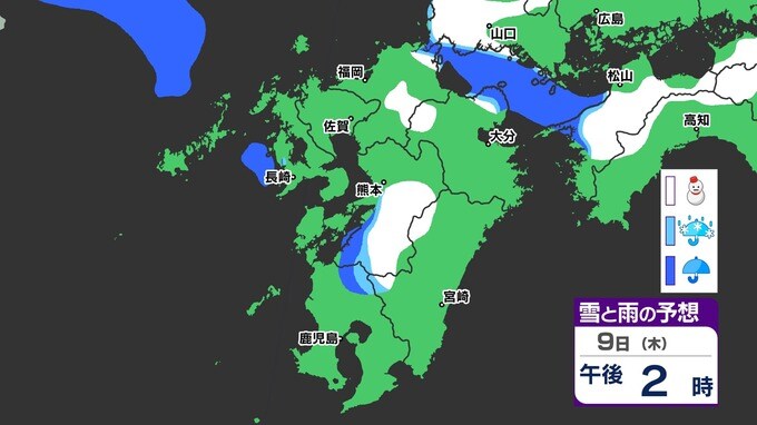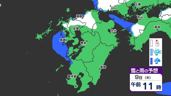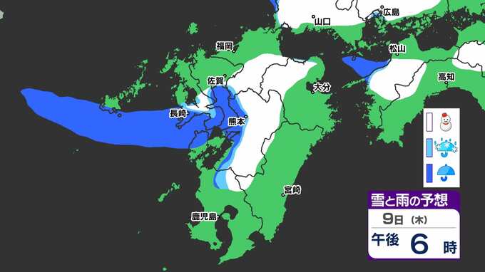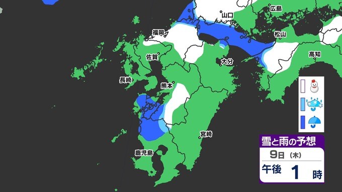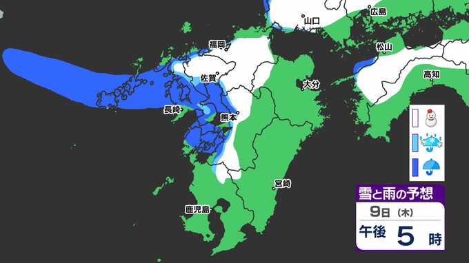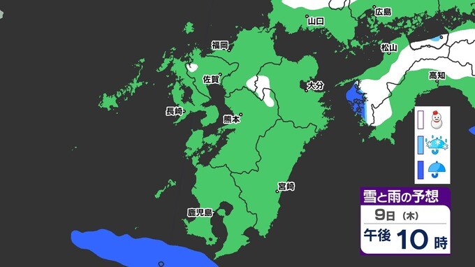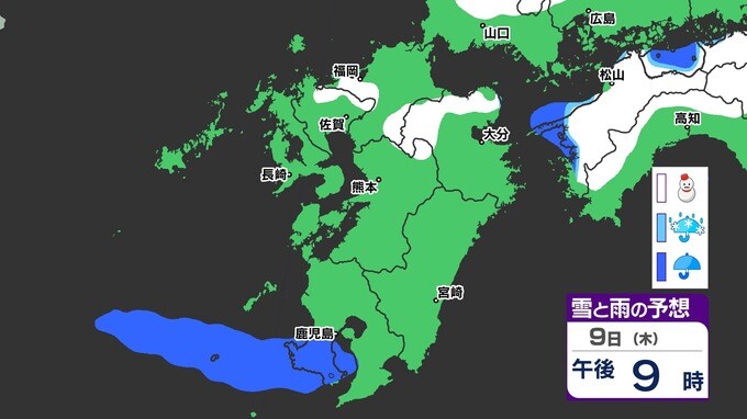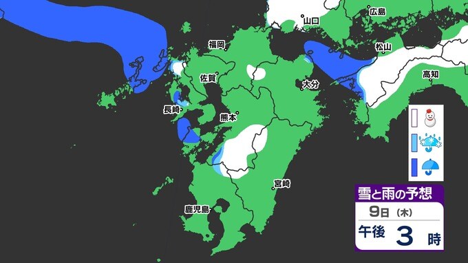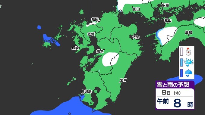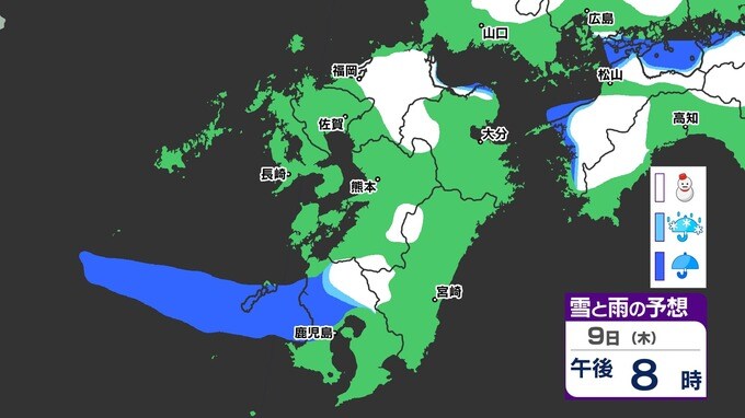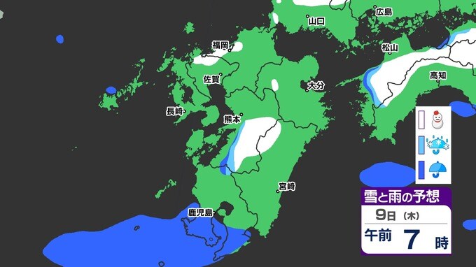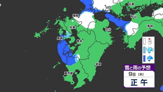 【九州きょうから寒い】寒気強まる 9日(木)10(金)は雪の予報【福岡・佐賀・長崎・大分・熊本・宮崎・鹿児島】雨と雪・寒気のシミュレーション 2025年1月7日(火) 12:00 国内 天気 『白』=『雪』/『水色』=『みぞれ(雨と雪が混ざったもの)』/『青』=『雨』の予想