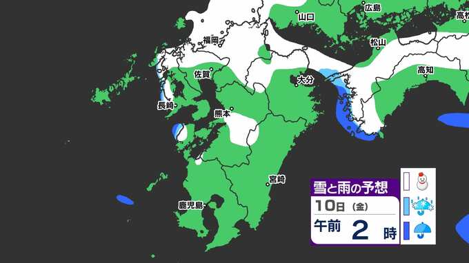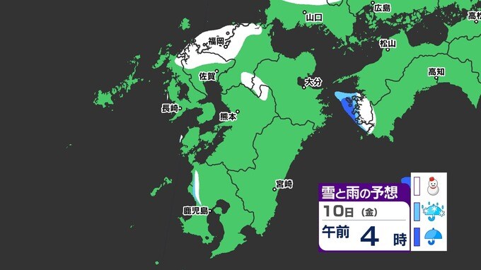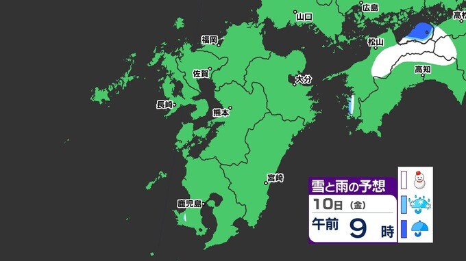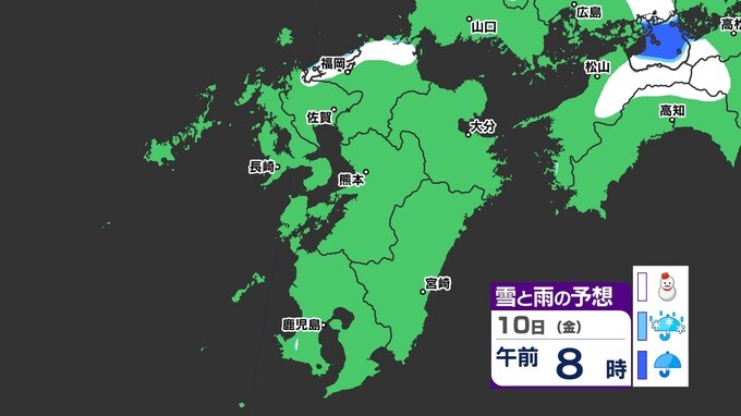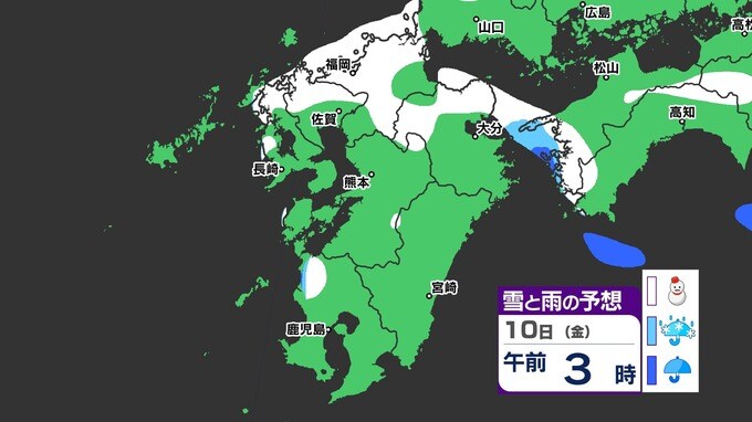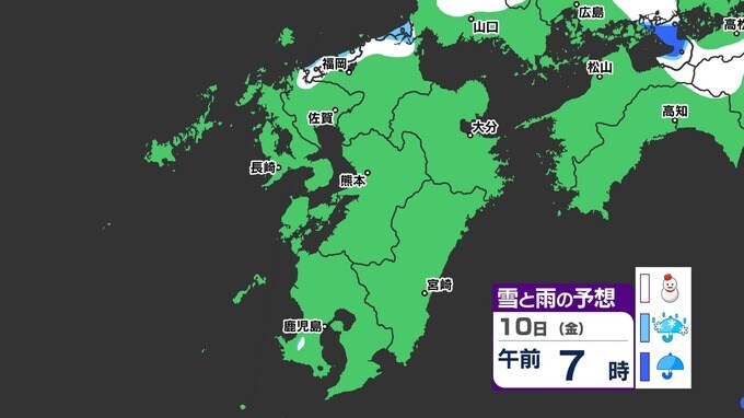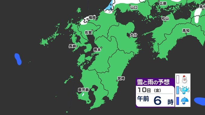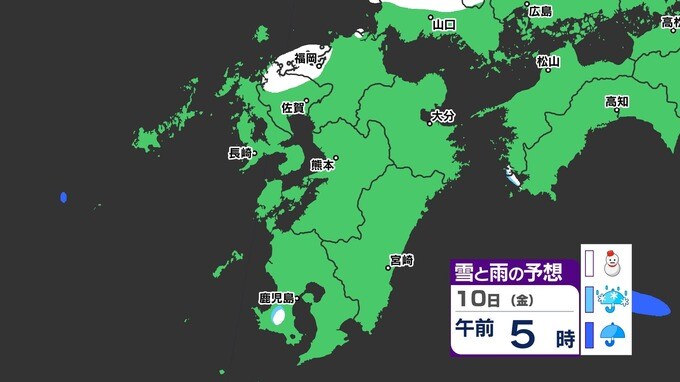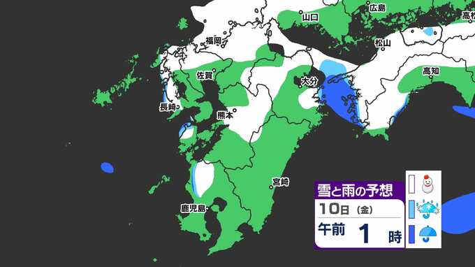 【暴風雪と大雪に関する気象情報】福岡県平地5cm予想に増加【福岡・佐賀・長崎・大分・熊本・宮崎・鹿児島】雪のシミュレーション/大雪予想 2025年1月9日(木) 18:30 国内 天気 『白』=『雪』/『水色』=『みぞれ(雨と雪が混ざったもの)』/『青』=『雨』の予想