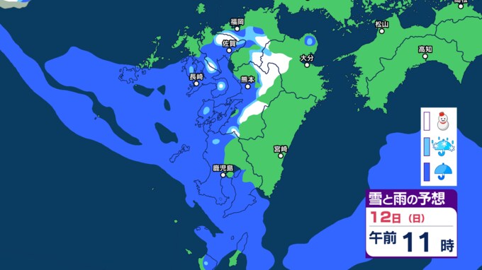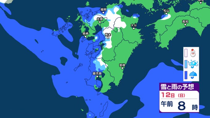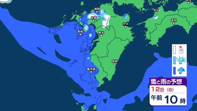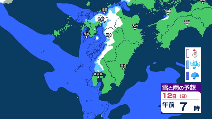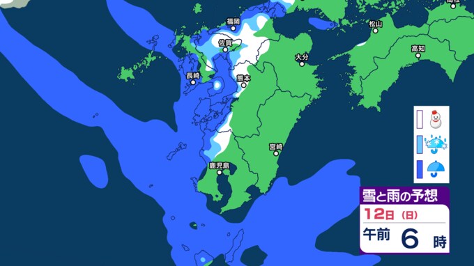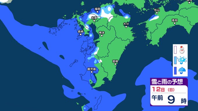 【九州3連休の天気】福岡山地で10センチ平地で3センチの降雪予想 【福岡・佐賀・長崎・大分・熊本・宮崎・鹿児島】雪のシミュレーション 2025年1月12日(日) 08:03 国内 天気 雪はいつどこで?雪のシミュレーション 12日(日)は雷を伴うところがあるでしょう。山間部は積雪のおそれがあるため今後の情報に注意してください。12日から13日の九州の雪シミュレーションは画像で掲載しています。 『白』=『雪』/『水色』=『みぞれ(雨と雪が混ざったもの)』/『青』=『雨』の予想