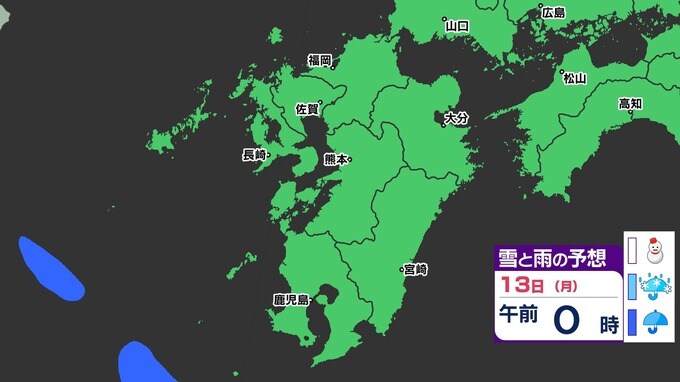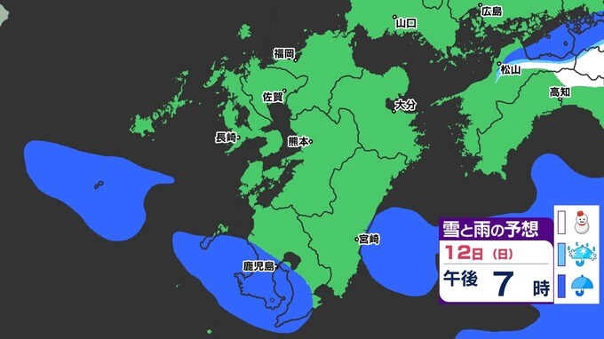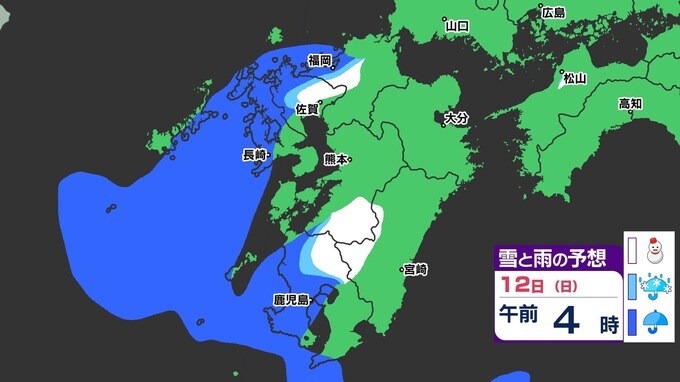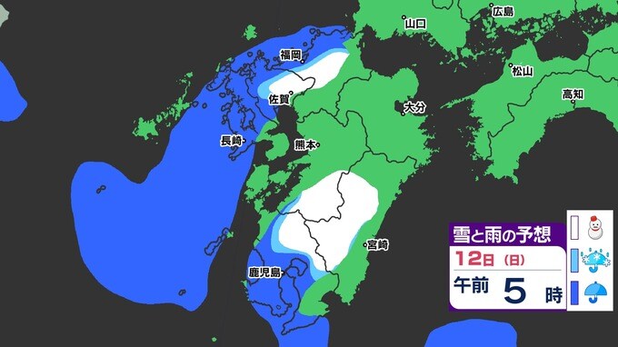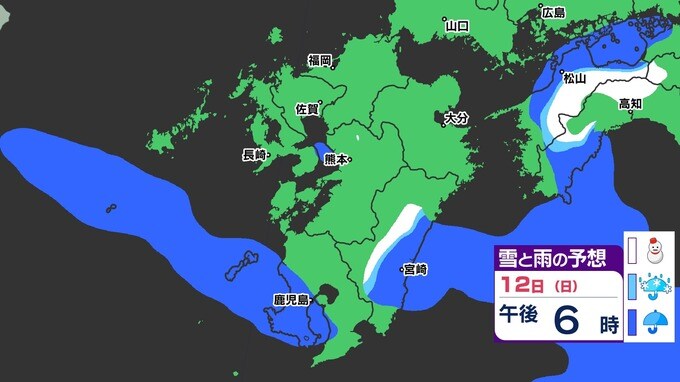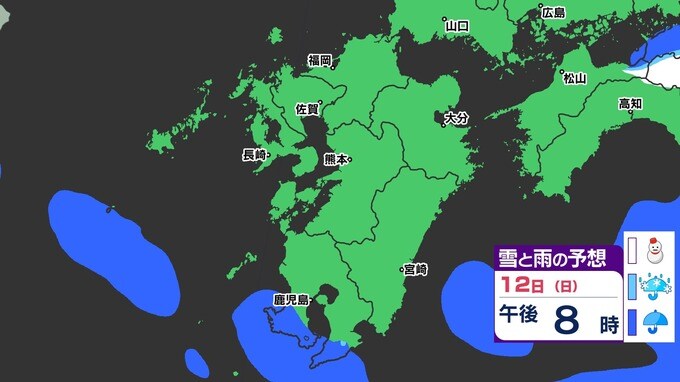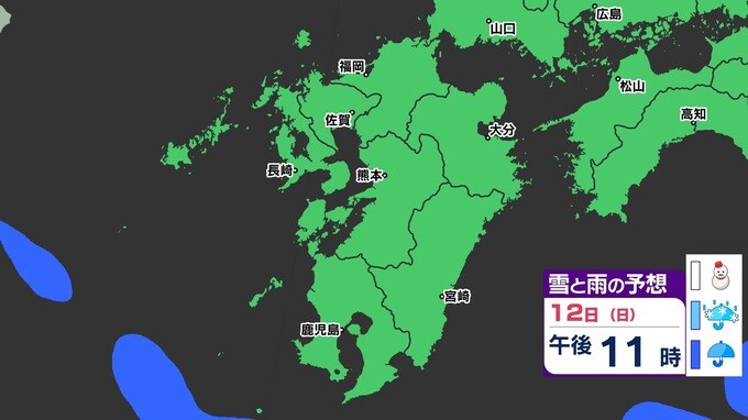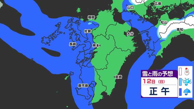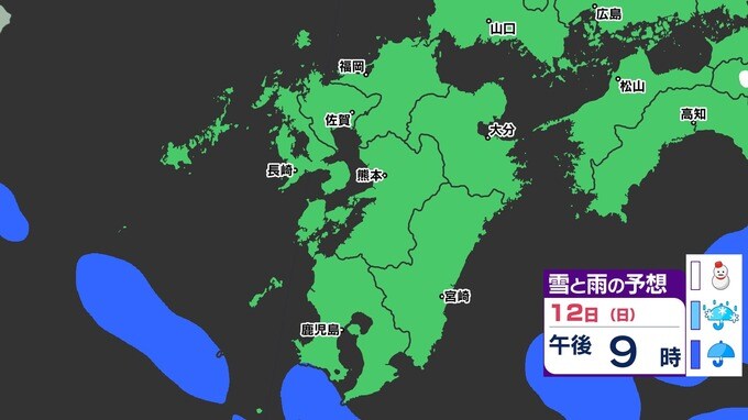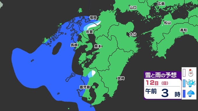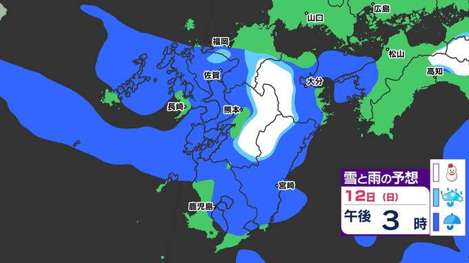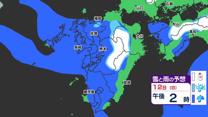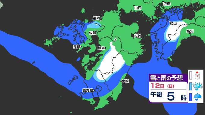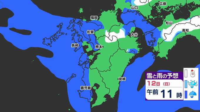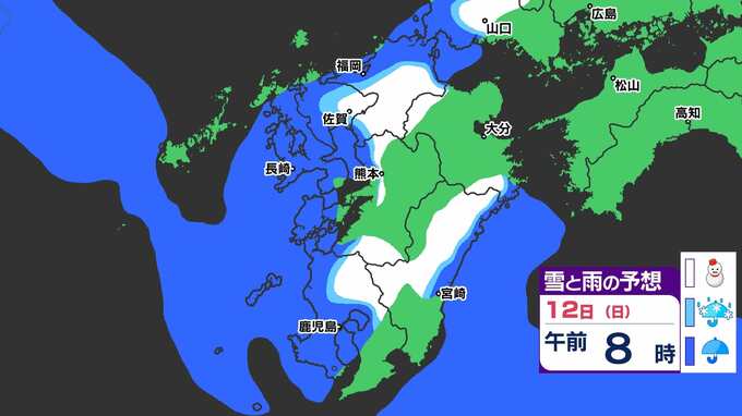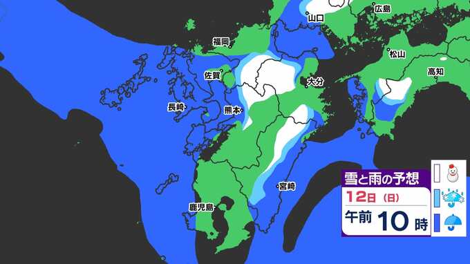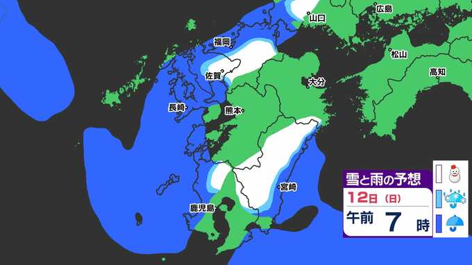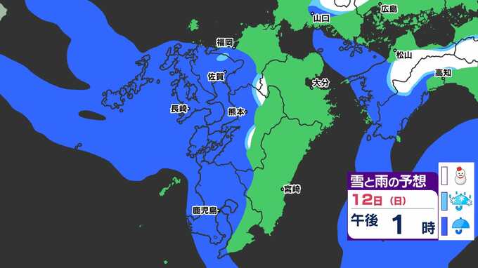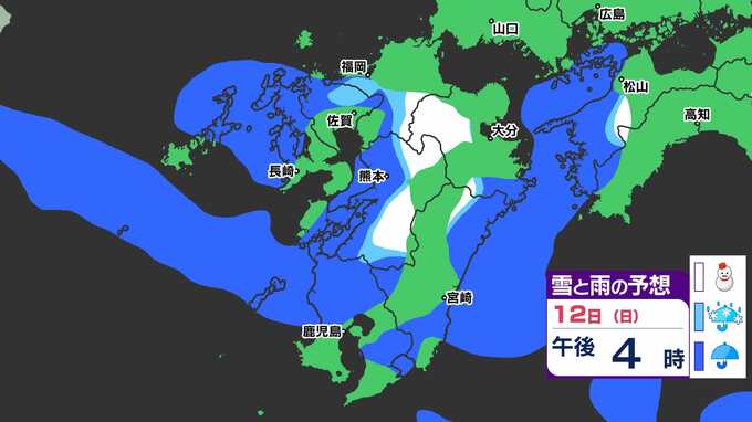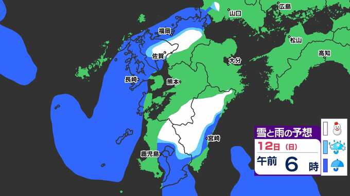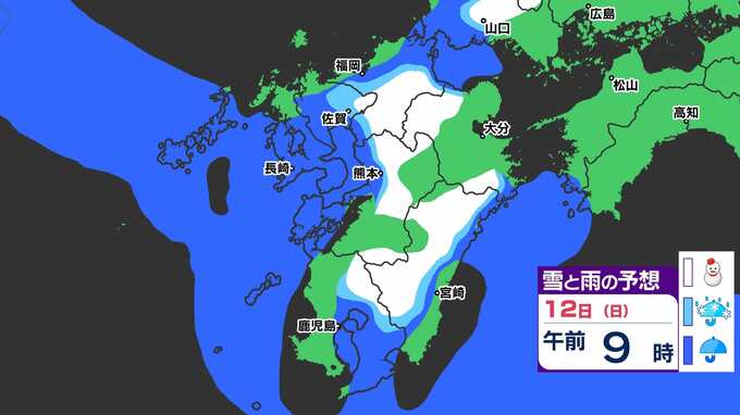 【大雪に関する気象情報】発表 12日(日)再び雪【福岡・佐賀・長崎・大分・熊本・宮崎・鹿児島】雪のシミュレーション / 3連休 成人式への影響は? 2025年1月10日(金) 19:00 国内 天気 雪のシミュレーション 画像で確認できます。 12日(日)は雷を伴うところがあるでしょう。今後の情報に注意してください。 『白』=『雪』/『水色』=『みぞれ(雨と雪が混ざったもの)』/『青』=『雨』の予想