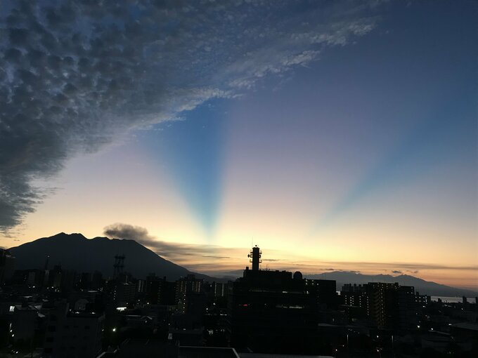 鹿児島の桜島付近の空で29日午前6時ごろ、「青い帯」のような2本の光の筋がまっすぐに伸びている様子が目撃されました。日の出直前の白み始めた地平線付近から、上空へと放射状に伸びています。