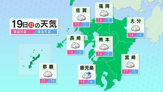 【九州土日&来週の天気】福岡・熊本の最高気温15℃前後【福岡・佐賀・長崎・大分・熊本・宮崎・鹿児島】雨と雲/寒気と暖気のシミュレーション 2025年1月17日(金) 16:20 国内 天気 18日(土)19日(日)の天気予報 画像で確認できます。 18日(土)移動性高気圧に覆われ晴れるでしょう。 19日(日)気圧の谷の影響で、雲が広がり九州南部では、雨が降る所がありますが、南風が暖かい空気を運んでくるでしょう。