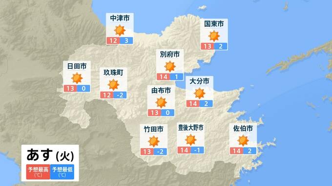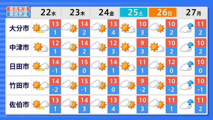 大分県・・・26日(日)頃まで晴れ、27日(月)は雨の予報。24日(金)頃までは、きょうと同じか高めの最高気温で、25日(土)は予想最高気温9~11℃。