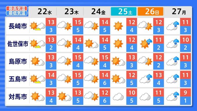 長崎県・・・25日(土)頃まで晴れ、26日(日)は下り坂、佐世保市・五島市では雨の予報。24日(金)頃までは、きょうと同じか高めの最高気温で、27日(月)は予想最高気温9~11℃。