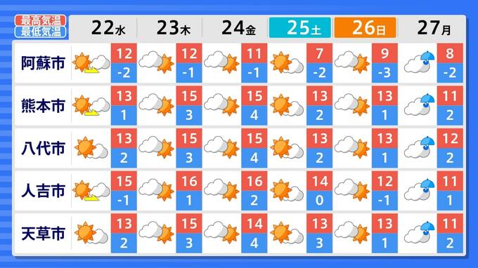 熊本県・・・26日(日)頃まで晴れ、27日(月)は雨の予報。24日(金)頃までは、きょうと同じか高めの最高気温で、27日(月)は予想最高気温8~12℃。