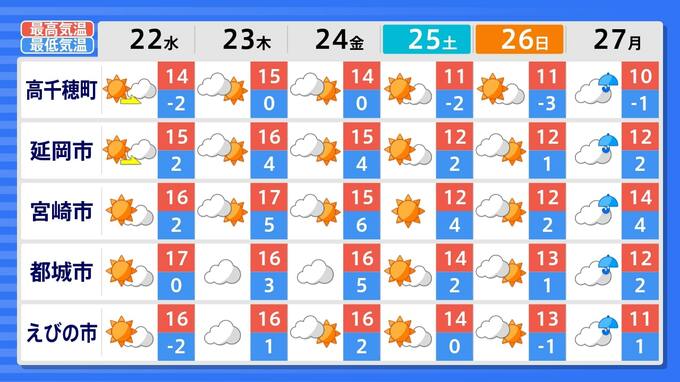 宮崎県・・・26日(日)頃まで晴れ、27日(月)は雨の予報。24日(金)頃までは、きょうと同じか高めの最高気温で、27日(月)は予想最高気温10~14℃。