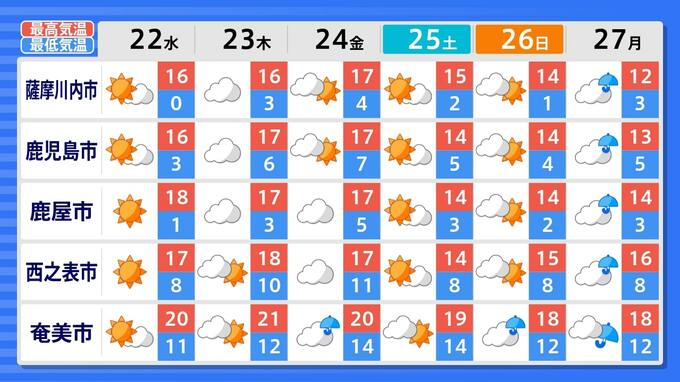 【九州今週の天気】大寒ですが「暖かい」来週は「寒い」【福岡・佐賀・長崎・大分・熊本・宮崎・鹿児島】週間予報&2週間気温予想 2025年1月20日(月) 17:20 国内 天気 鹿児島県・・・26日(日)頃まで晴れ、27日(月)は雨の予報。24日(金)頃までは、きょうと同じか高めの最高気温で、27日(月)県本土は予想最高気温12~14℃。