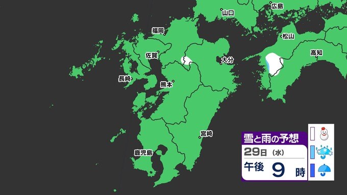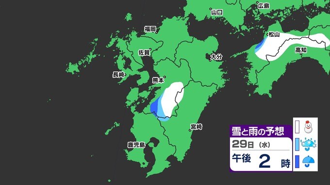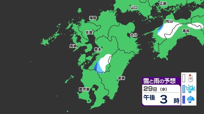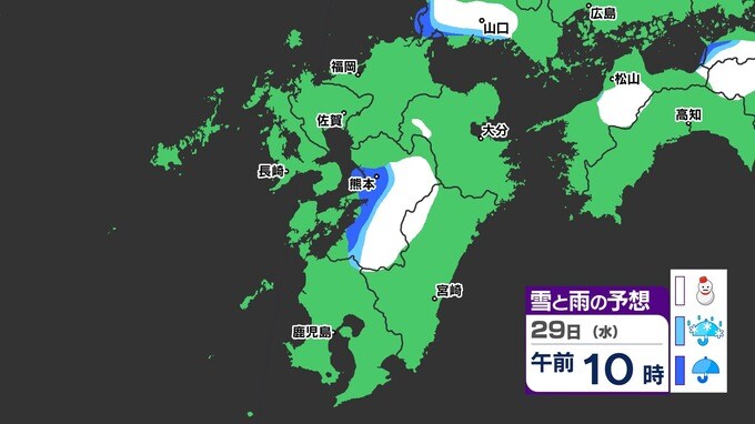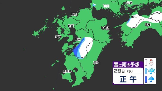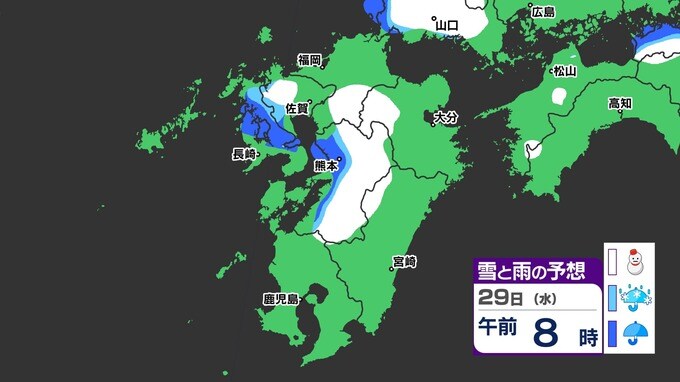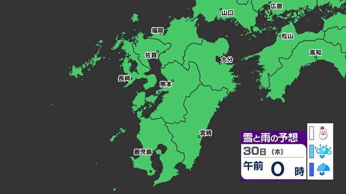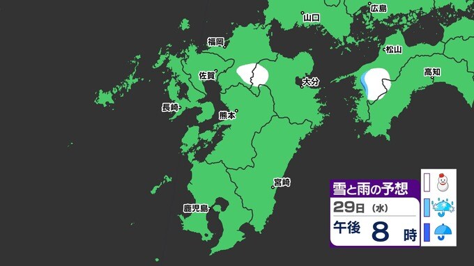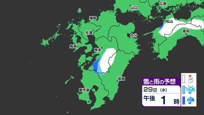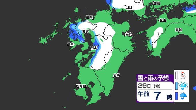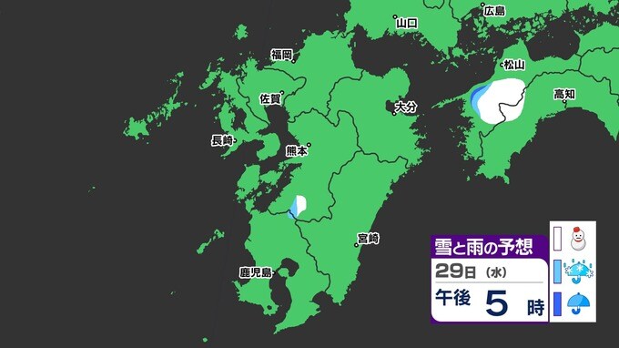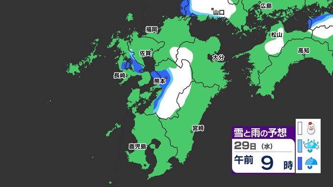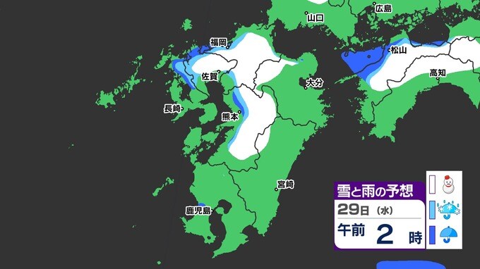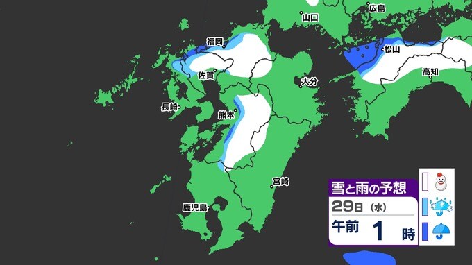 【大雪に関する気象情報】福岡県山地20cmに予想降雪量増える【福岡・佐賀・長崎・大分・熊本・宮崎・鹿児島】雪のシミュレーション 2025年1月27日(月) 17:00 国内 天気 『白』=『雪』/『水色』=『みぞれ(雨と雪が混ざったもの)』/『青』=『雨』の予想
