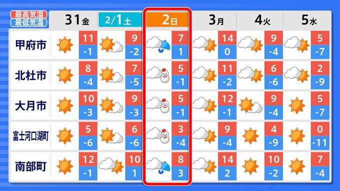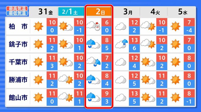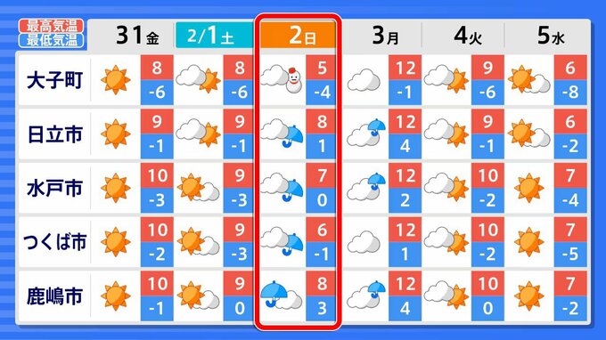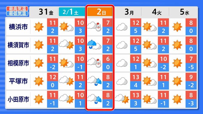 【東京・神奈川・首都圏2月2日(日)雪か?】中学入試 受験生 特に注意【雪はどこで いつから降る? 雪のシミュレーション】東京・神奈川・埼玉・千葉・群馬・栃木・茨城・山梨の天気予報 2025年1月30日(木) 15:00 国内 天気 週間予報(2月2日は雪マーク) 2月1日(土)下り坂、2日(日)関東地方の広い範囲に《雪》の予報が発表されています。週間予報は都・県ごとに画像で確認できます。 東京都 島しょ部では大丈夫だが、2日(日)千代田区や八王子では雪の予報 神奈川県 2日(日)横浜市・相模原市で雪の予報 埼玉県 2日(日)全域で雪の予報 千葉県 2日(日)柏市で雪の予報 群馬県 2日(日)全域で雪の予報 栃木県 2日(日)全域で雪の予報 茨城県 2日(日)大子町で雪の予報 山梨県 2日(日)北杜市・大月市・富士河口湖町で雪の予報