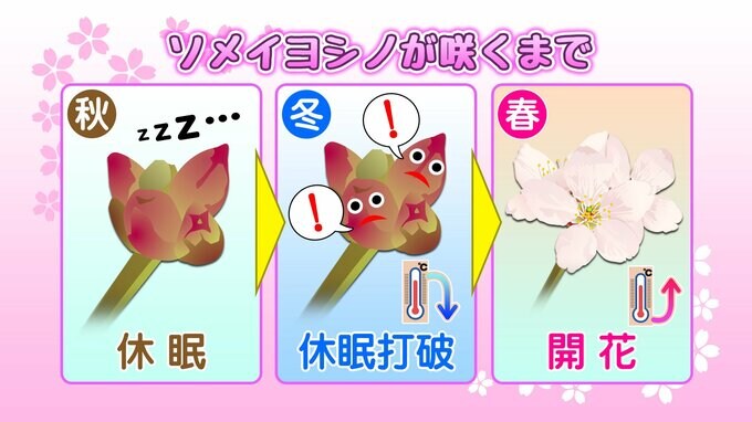 3)この「休眠打破」のあとに、春先の気温の 上昇に合わせて花芽が発育し、開花します。 (気象庁HPより)
