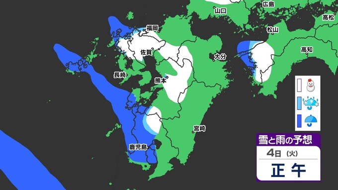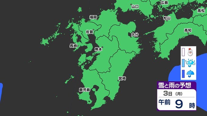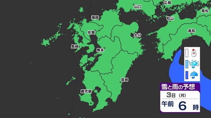 【大雨 その次は 立春なのに寒波】荒れ模様の2月スタート【福岡・佐賀・長崎・大分・熊本・宮崎・鹿児島】雨・雪のシミュレーション 2025年1月30日(木) 13:00 国内 天気 2月3日(月)~4日(火)雨のシミュレーション 3日(月)は熊本・宮崎の県境の山沿いで雪が予想されていますが、時間は短いです。 4日(火)福岡・佐賀・長崎・大分・熊本・宮崎・鹿児島の平地にも雪が予想されています。6日(木)にかけて雪が続く見込みです。 『白』=『雪』/『水色』=『みぞれ(雨と雪が混ざったもの)』/『青』=『雨』の予想