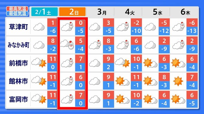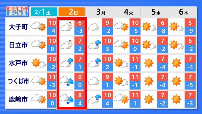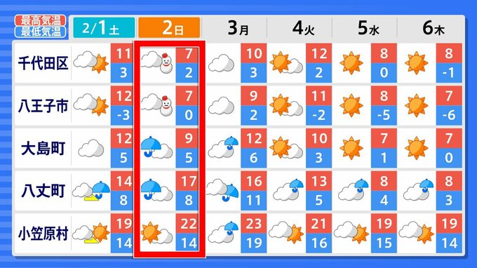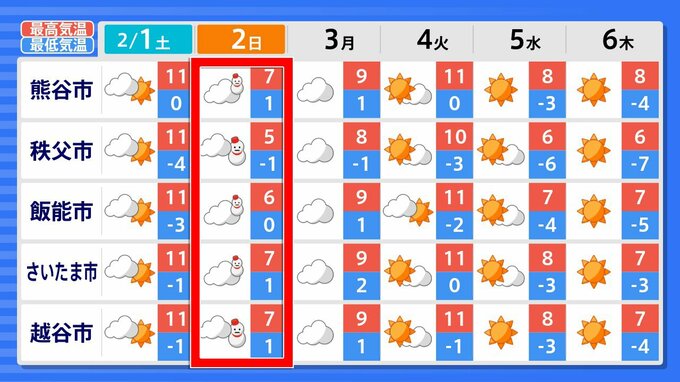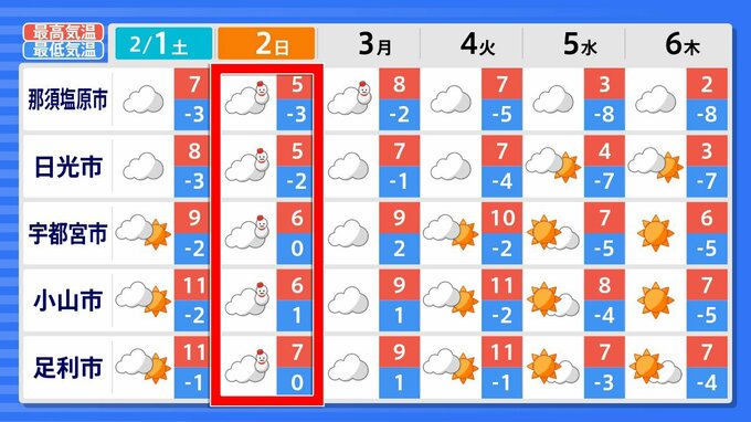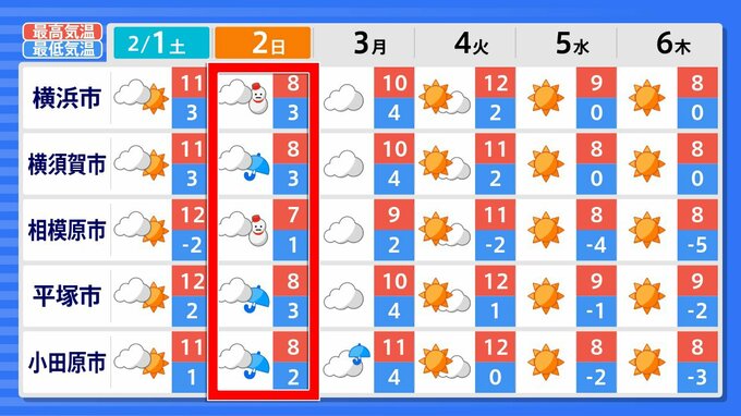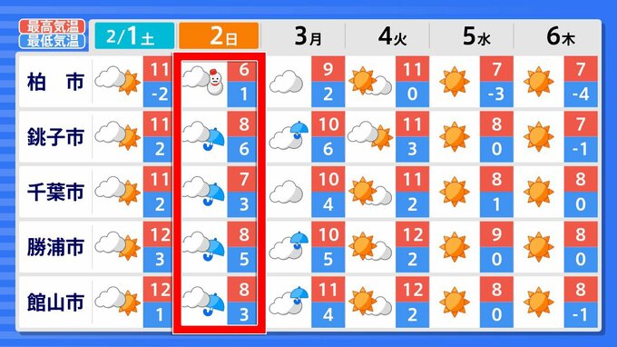 2日(日)関東地方の広範囲で《雪》の予報、気温が上がらずとても寒い
