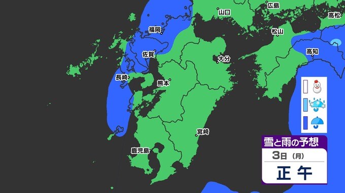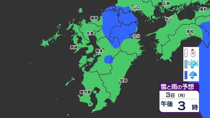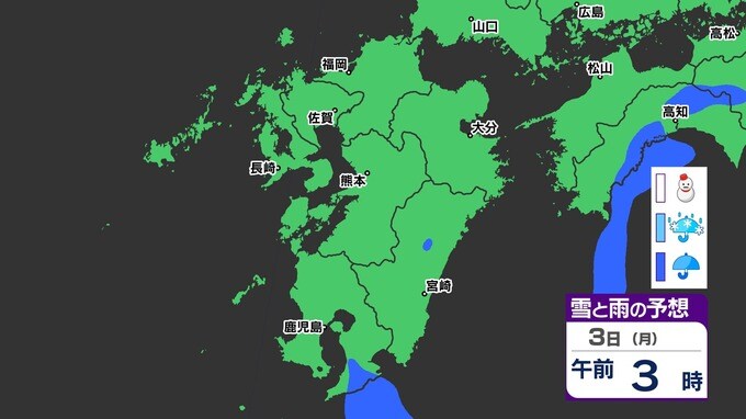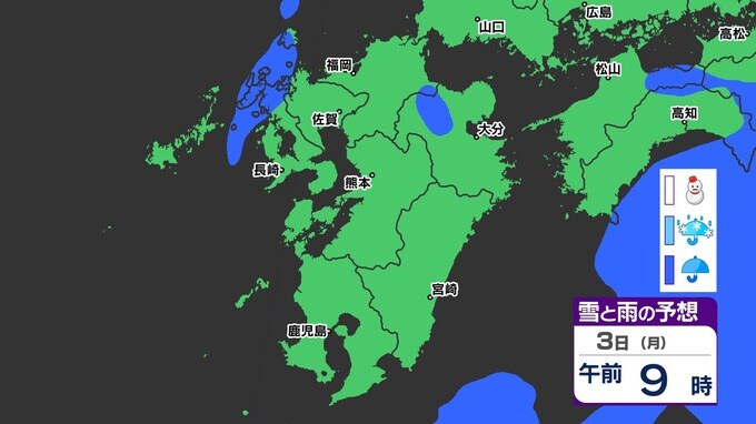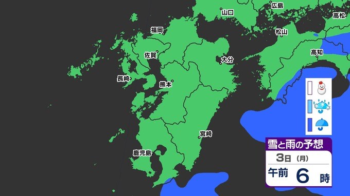 【立春寒波】福岡、熊本など平地も大雪おそれ「今季最強寒波」来週の雪は今週より多い【福岡・佐賀・長崎・大分・熊本・宮崎・鹿児島】雪のシミュレーション 2025年1月30日(木) 19:45 国内 天気 2月3日(月)~4日(火)雪のシミュレーション 3日(月)は熊本・大分の県境の山沿いで雪が予想されていますが、時間は短いです。 4日(火)福岡・佐賀・長崎・大分・熊本・宮崎・鹿児島の平地にも雪が予想されています。6日(木)にかけて雪が続く見込みです。 『白』=『雪』/『水色』=『みぞれ(雨と雪が混ざったもの)』/『青』=『雨』の予想