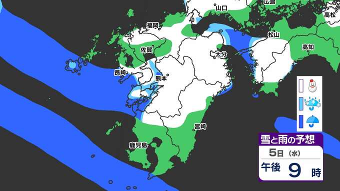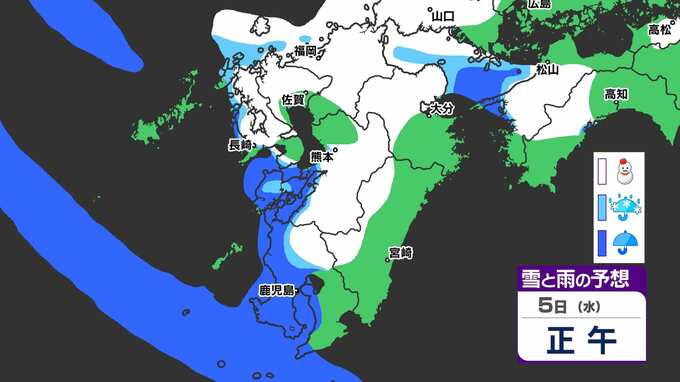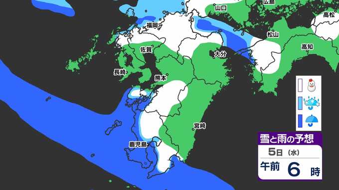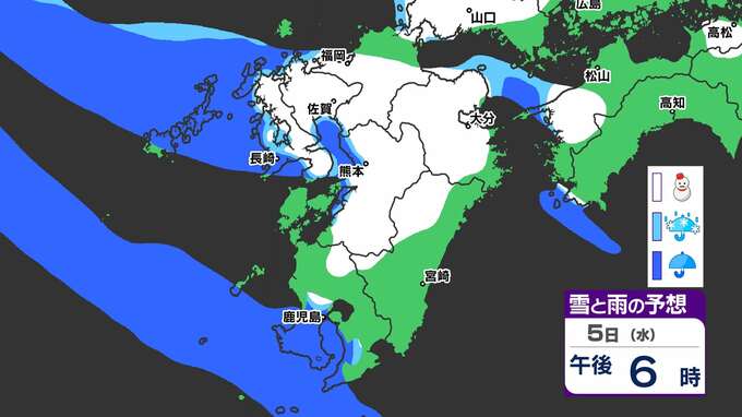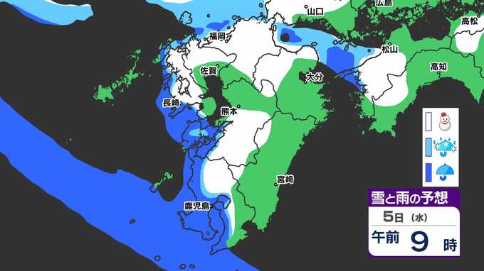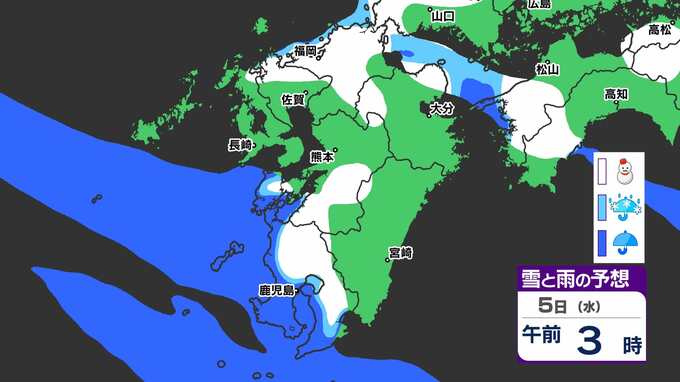 【立春寒波】福岡、熊本など平地も大雪おそれ「今季最強寒波」雪はいつ どこで降る?【福岡・佐賀・長崎・大分・熊本・宮崎・鹿児島】雪のシミュレーション 2025年1月31日(金) 21:30 国内 天気 『白』=『雪』/『水色』=『みぞれ(雨と雪が混ざったもの)』/『青』=『雨』の予想
