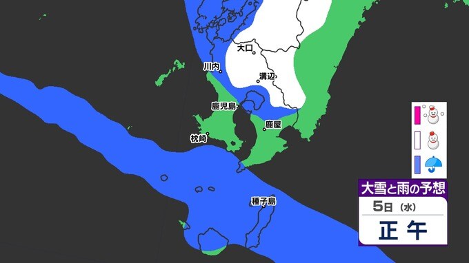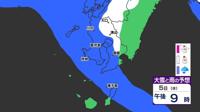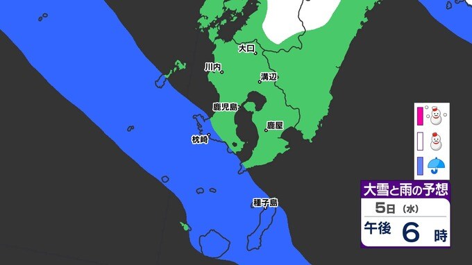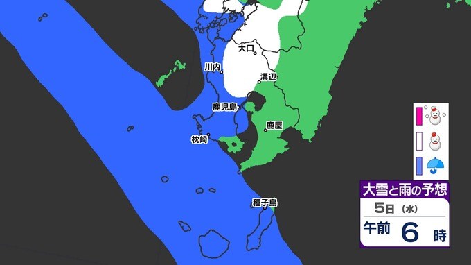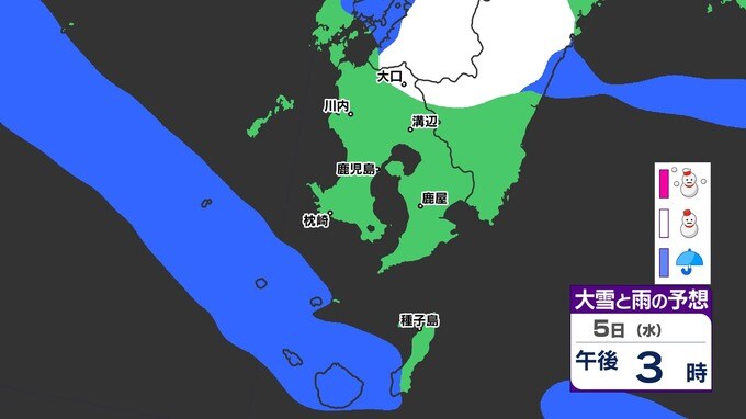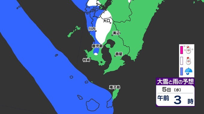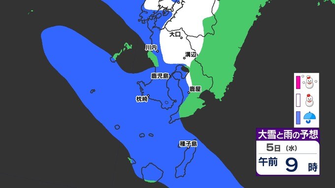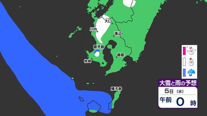 【鹿児島 大雪に関する気象情報】薩摩平地17cm 大隅平地5cm 平地でも積雪のおそれ 雪のシミュレーション 2025年2月3日(月) 17:25 国内 天気 『白』=『雪』/『水色』=『みぞれ(雨と雪が混ざったもの)』/『青』=『雨』の予想