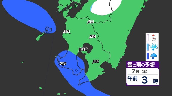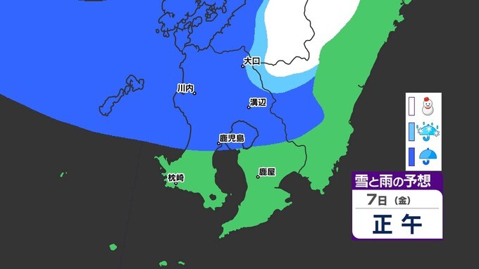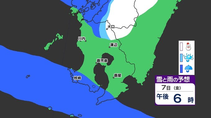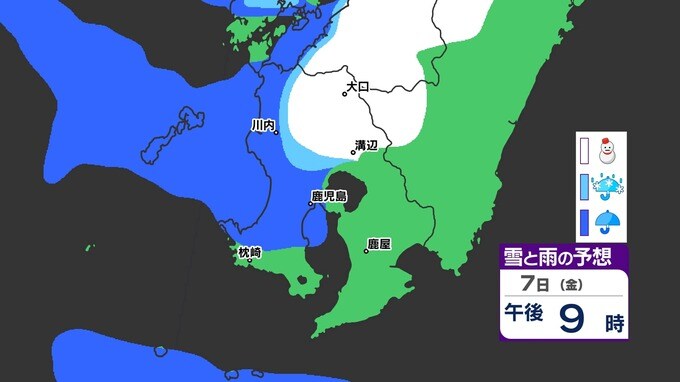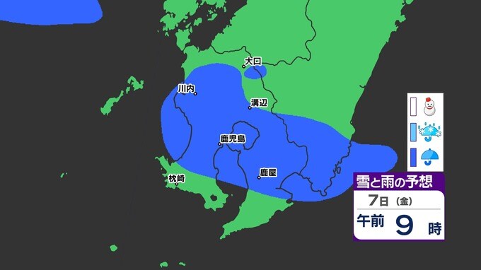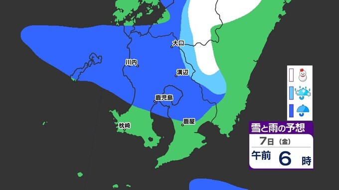 【大雪情報】鹿児島 昼前にかけて大雪おそれ【薩摩地方 山地15cm 平地10cm】9日(日)までの雪シミュレーション「7日(金)以降も雪が続く見込み」 2025年2月5日(水) 09:40 国内 天気 『白』=『雪』/『水色』=『みぞれ(雨と雪が混ざったもの)』/『青』=『雨』の予想