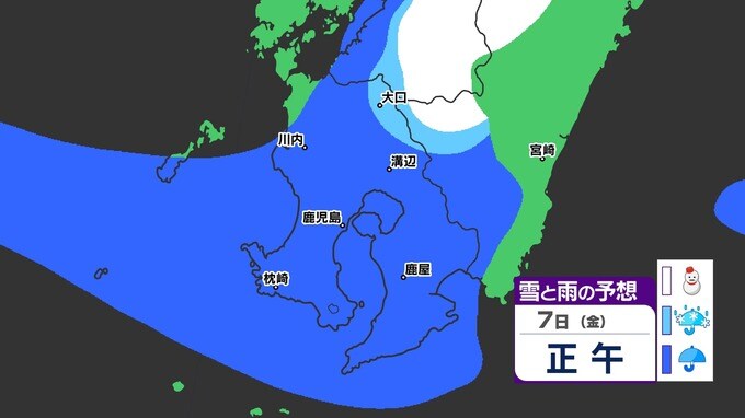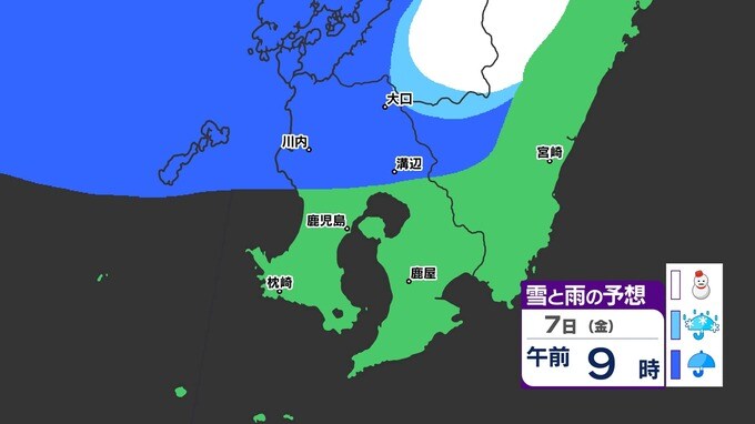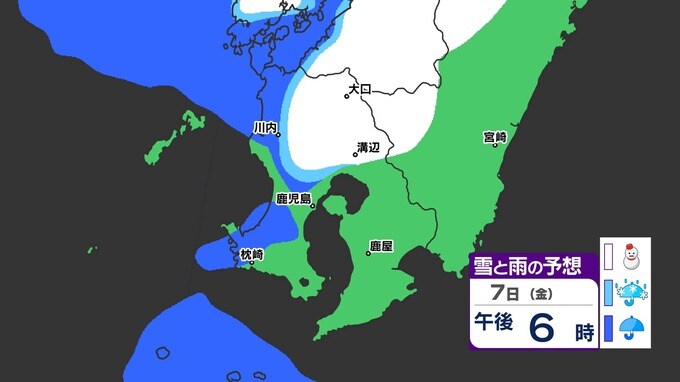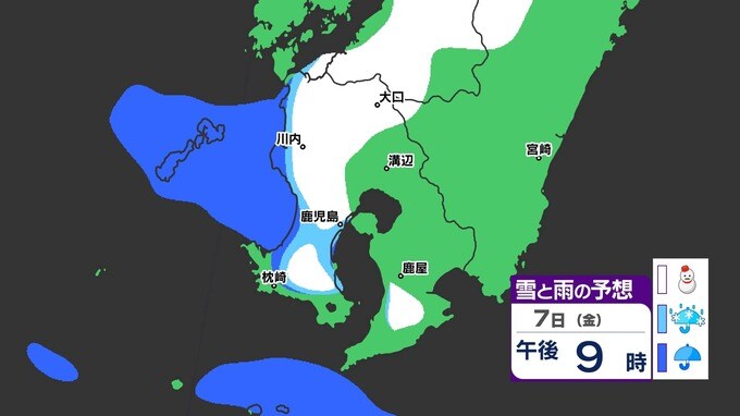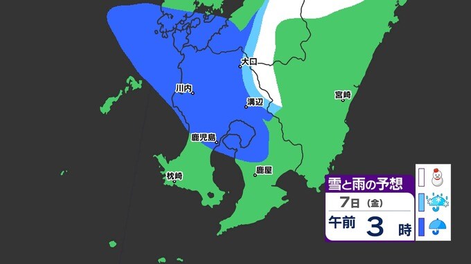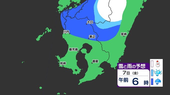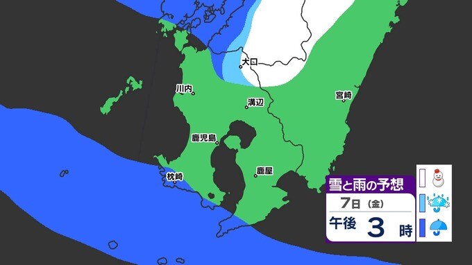 【鹿児島 大雪情報】あす明け方にかけて大雪のおそれ 【薩摩地方 山地10cm 平地5cmの雪(多い所)】雪のシミュレーション 2025年2月5日(水) 19:45 国内 天気 『白』=『雪』/『水色』=『みぞれ(雨と雪が混ざったもの)』/『青』=『雨』の予想