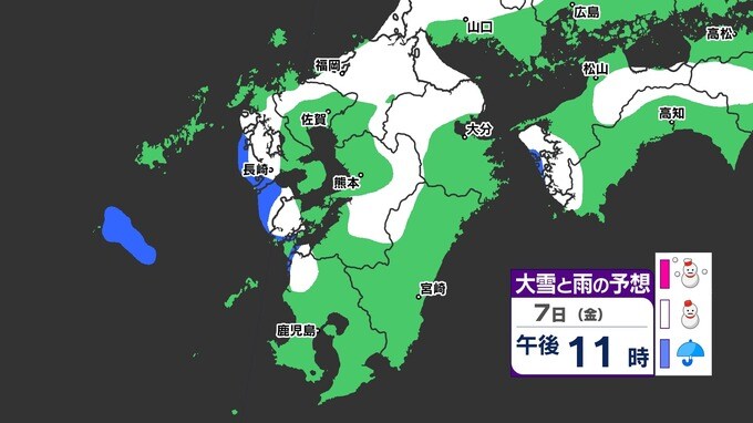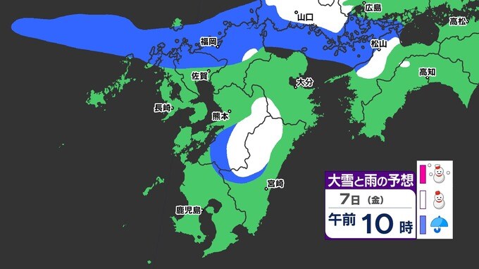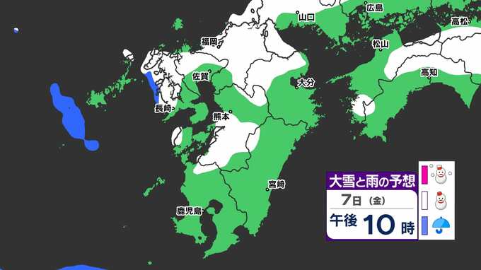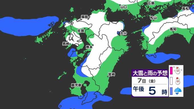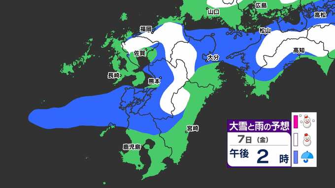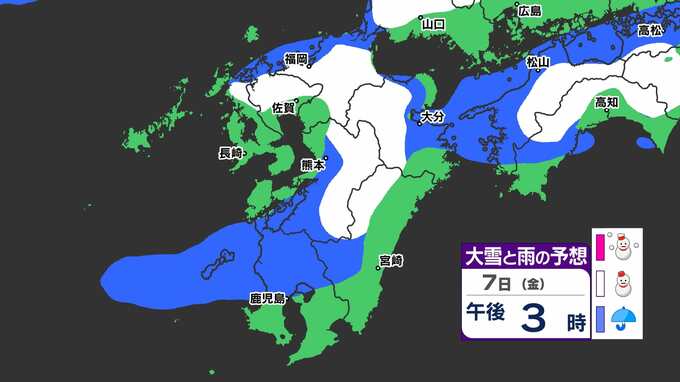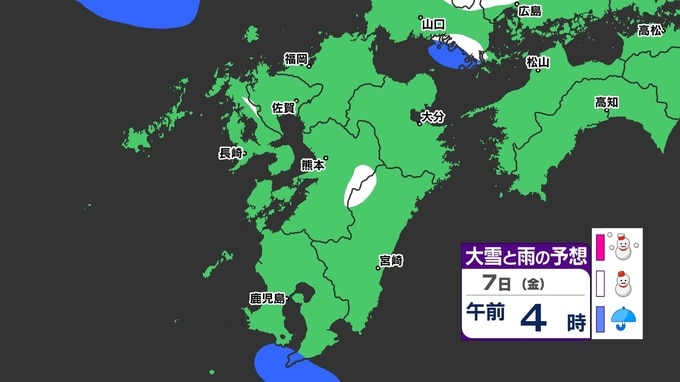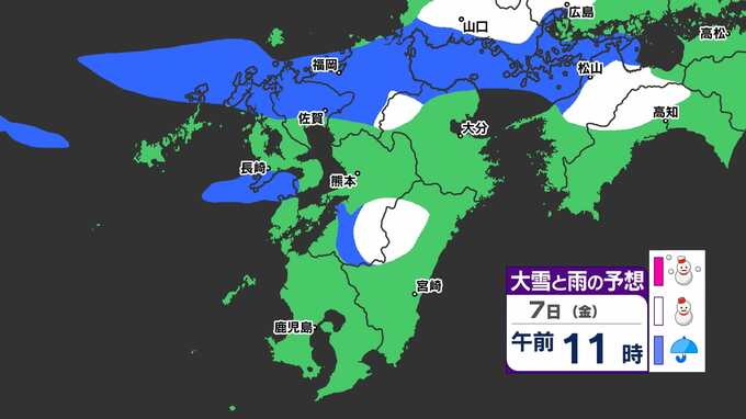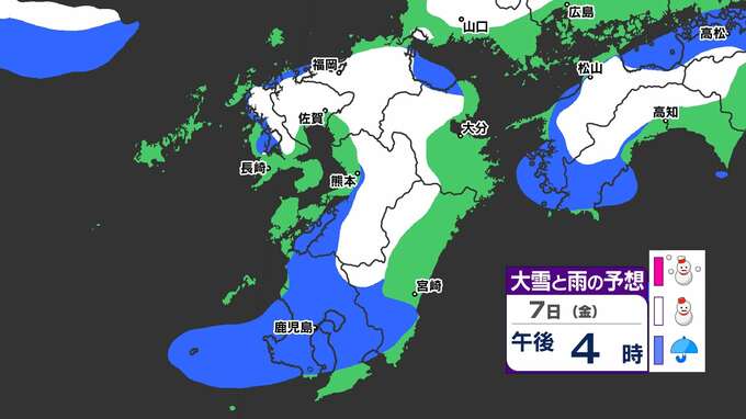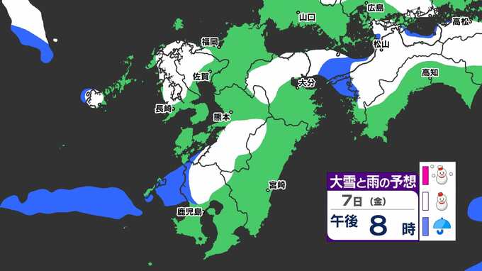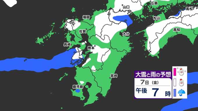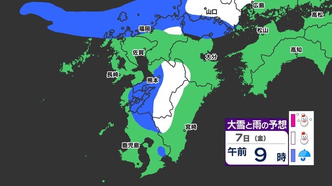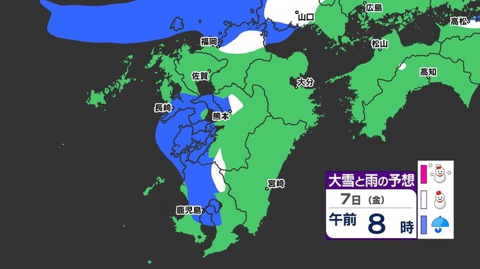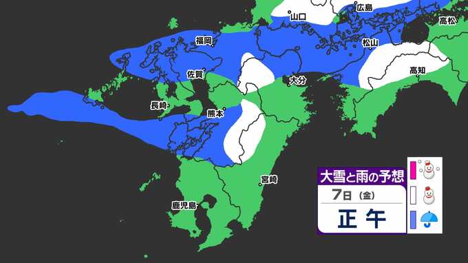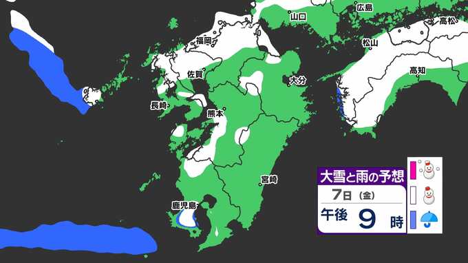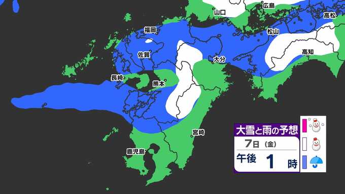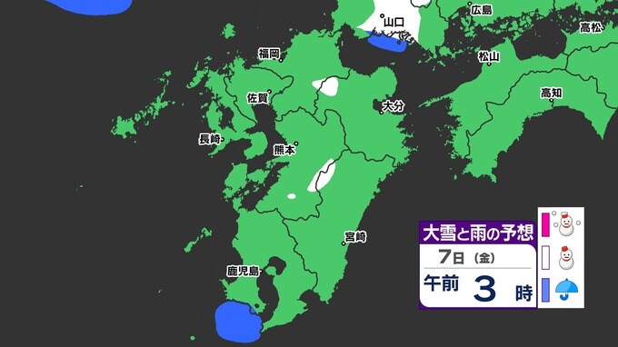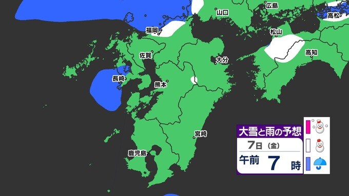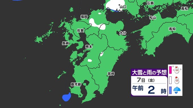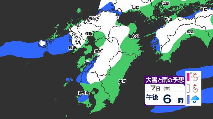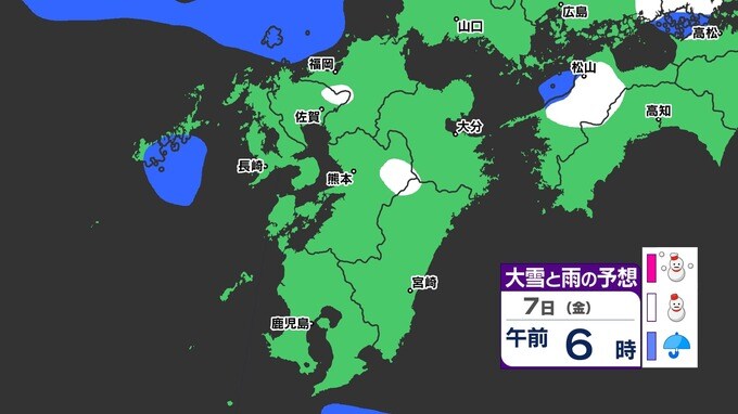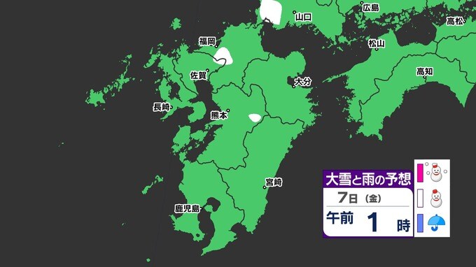 【大雪情報】福岡25cm 熊本20cm 寒波2回目のピークへ【福岡・佐賀・長崎・大分・熊本・宮崎・鹿児島】雪のシミュレーション 2025年2月6日(木) 19:00 国内 天気 『赤』=『大雪』/『白』=『雪』/『青』=『雨』の予想
