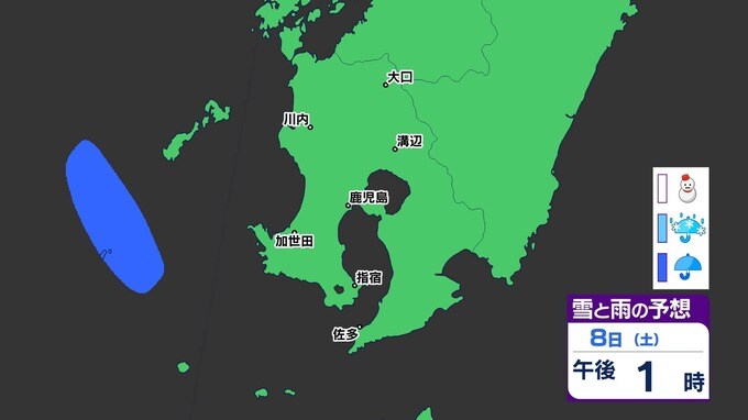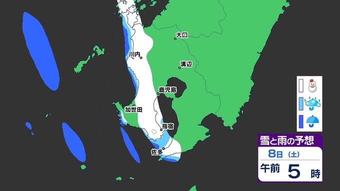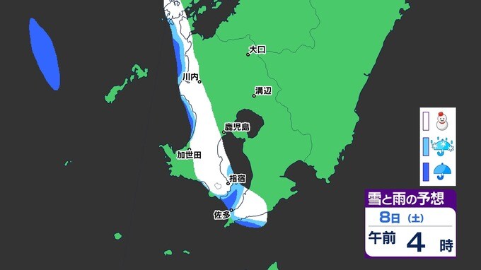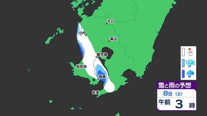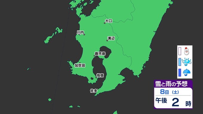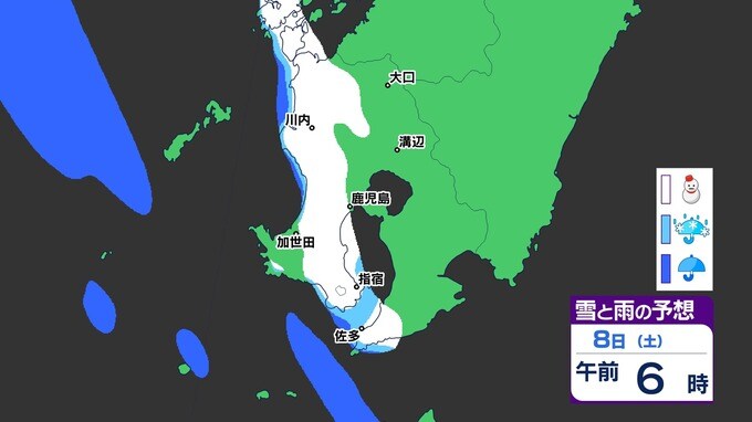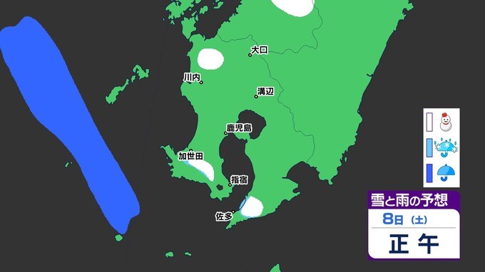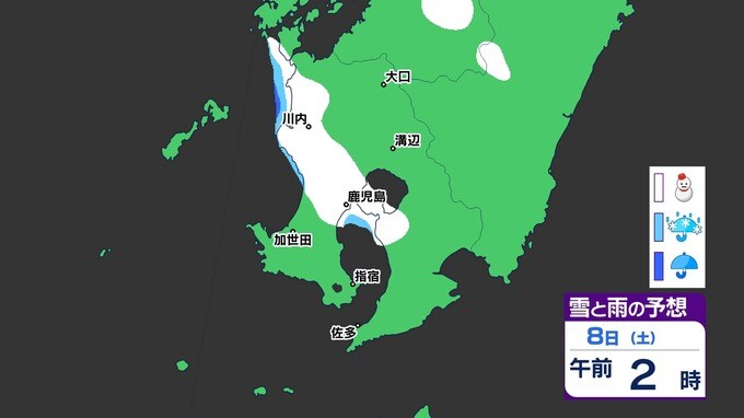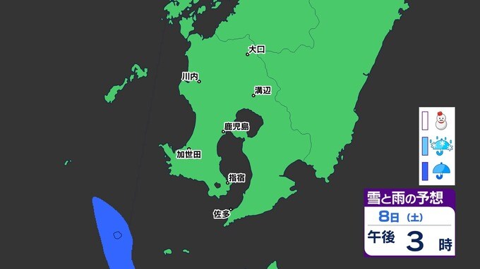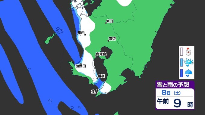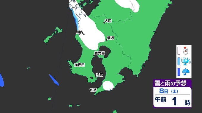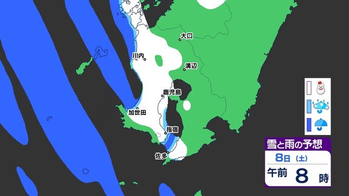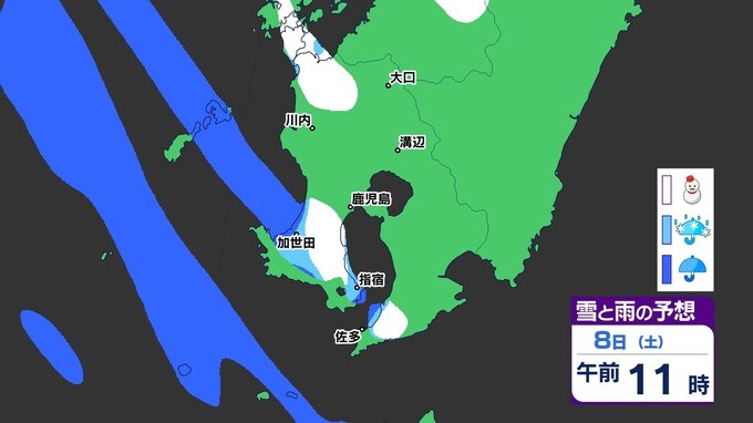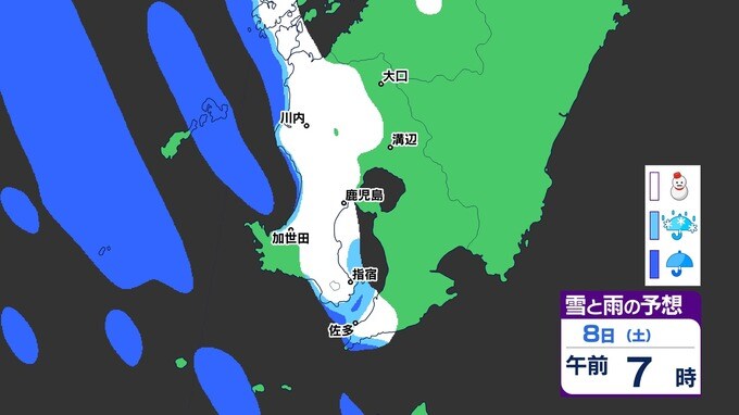 【鹿児島 大雪情報】昼前にかけて大雪のおそれ 寒波第2波へ【薩摩地方 山地5cm 平地3cm降雪予想】雪のシミュレーション 2025年2月7日(金) 17:40 国内 天気 『白』=『雪』/『水色』=『みぞれ(雨と雪が混ざったもの)』/『青』=『雨』の予想