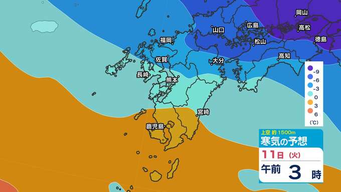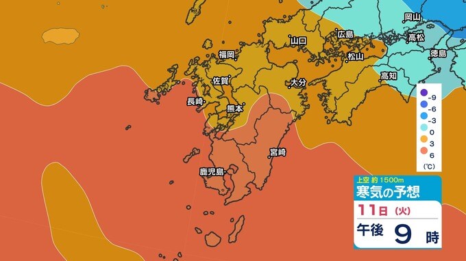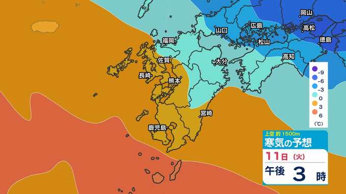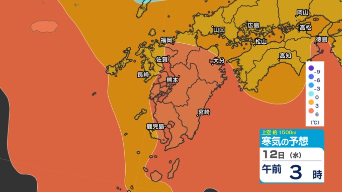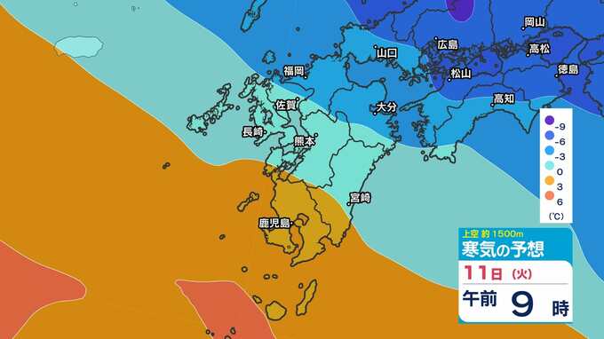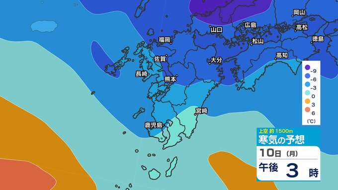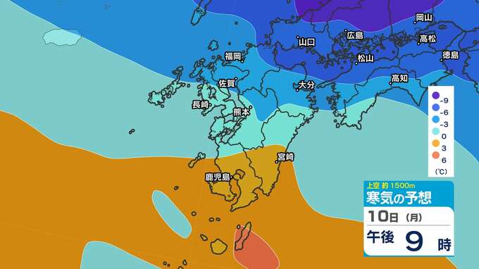 【大雪のあとは大雨】11日(火祝)寒さゆるみ花粉増加 12日(水)15℃超の所も 春一番か?【福岡・佐賀・長崎・大分・熊本・宮崎・鹿児島】雨と風のシミュレーション 2025年2月10日(月) 17:40 国内 天気 寒気と暖気のシミュレーション 10日(月)~12日(水) 画像で確認できます。 九州上空には10日(月)午前9時には、氷点下9度以下の寒気に覆われていますが、北へ退散し九州上空には春の暖かい空気が流れ込んできます。