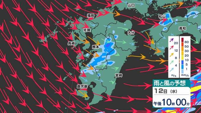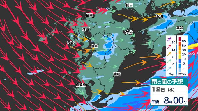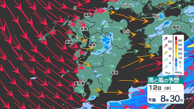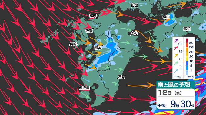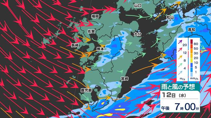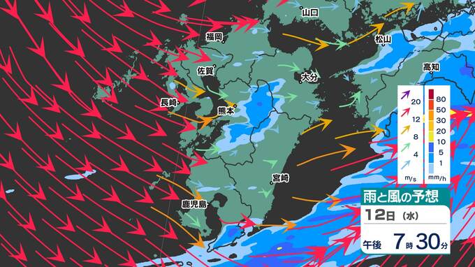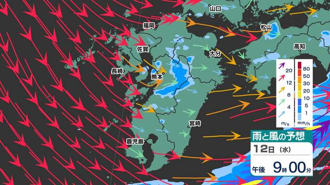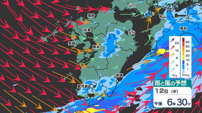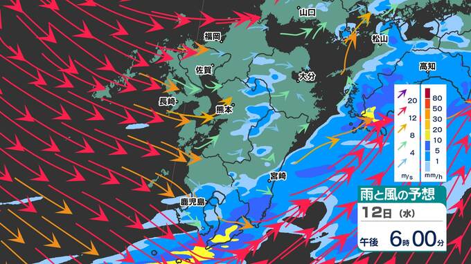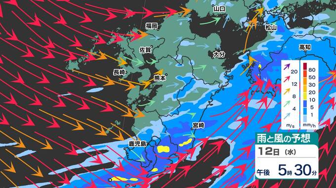 【雨はいつまで?】風強い やや荒れた天気に 気温上昇 福岡市15℃ 鹿児島市18℃【福岡・佐賀・長崎・大分・熊本・宮崎・鹿児島】雨と風のシミュレーション 2025年2月12日(水) 16:45 国内 天気 雨と風のシミュレーション(30分ごと) 画像で確認できます。 鹿児島県では活発な雨雲がかかりそうです。また、前線通過前は南風、通過後は西風が強めに吹くでしょう。お帰りの時間は雨が止んでいるところが多いですので〈傘の置忘れ〉にご注意ください。 矢印は風向きと風の強さを表しています。