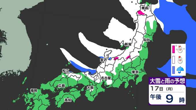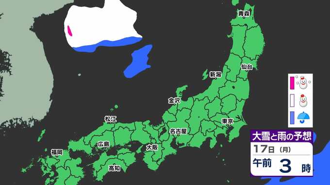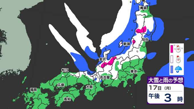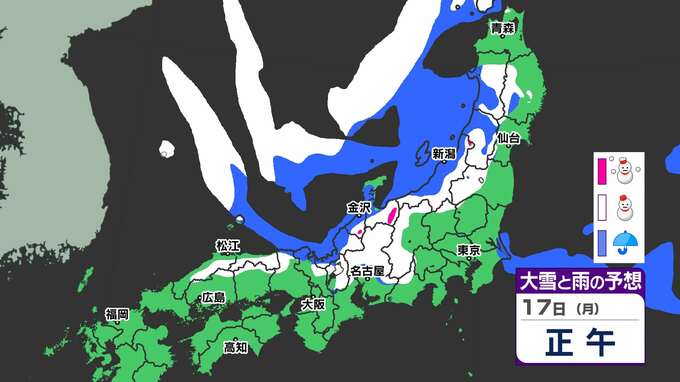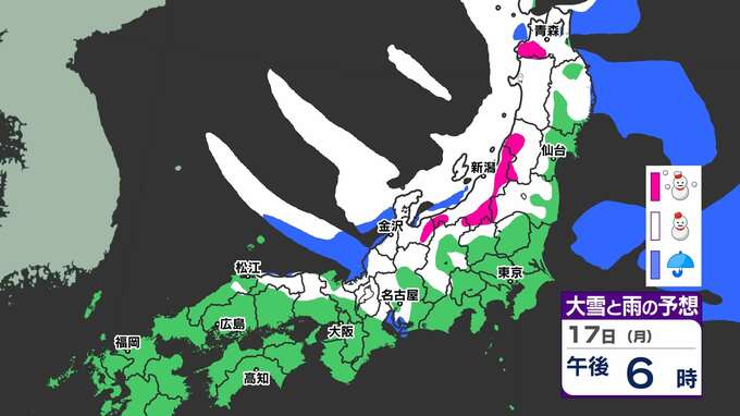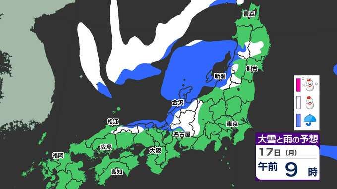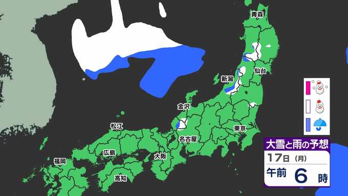 【大雪情報】17日(月)から寒波「大雪に関する気象情報」気象庁発表 警報級の大雪のおそれ 【大雪はいつどこで?】大雪&寒気シミュレーション17日(月)~21日(金) 2025年2月16日(日) 20:00 国内 天気 17日(月)~21日(金)大雪シミュレーション 17日(月)昼ごろから大雪の予想が出てきます。日本海側では21日(金)にかけて雪が続いています。17日(月) ~21日(金)の大雪シミュレーションは、画像で掲載しています。 「赤」は「大雪」、「白」は「雪」、「青」は雨の予想