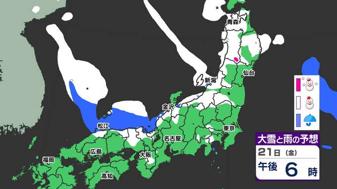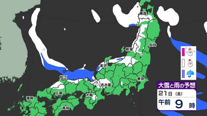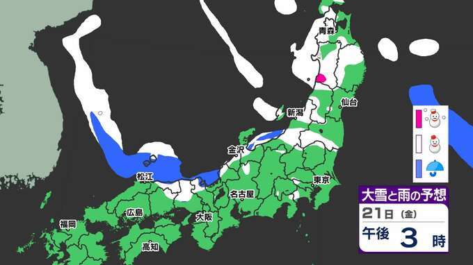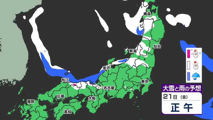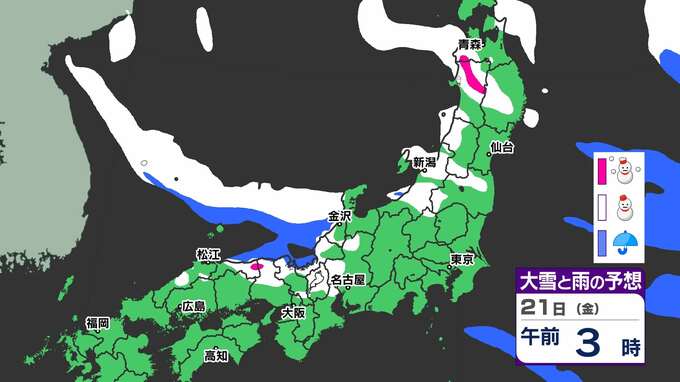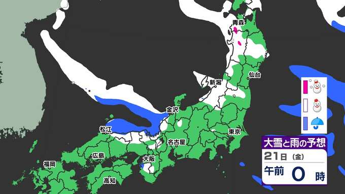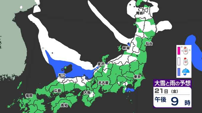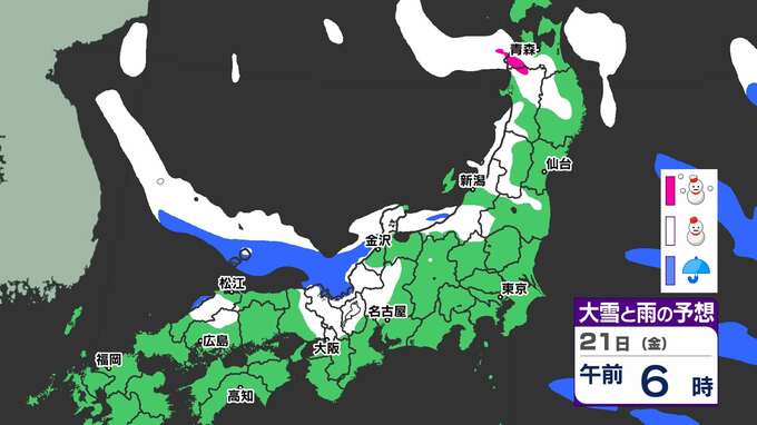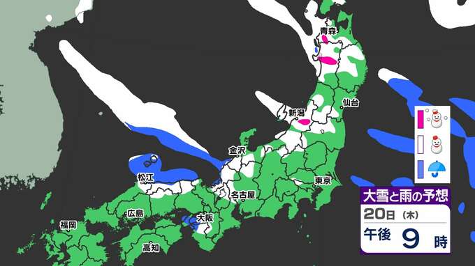 【強烈寒波】3連休に次のピークか? 酸ヶ湯506cm積雪 12年ぶりに5m到達 【雪のシミュレーション20日(木)~25日(火)】気象庁長官「何日も雪が続くことで非常に大きな積雪量に」 2025年2月20日(木) 19:30 国内 天気 雪のシミュレーション20日(木)~25日(火) 3連休最終日24日(月振)まで雪が続きますが、3連休明け25日(火)やっと雪は収まりそうです。画像で確認できます。 「赤」は「大雪」、「白」は「雪」、「青」は雨の予想