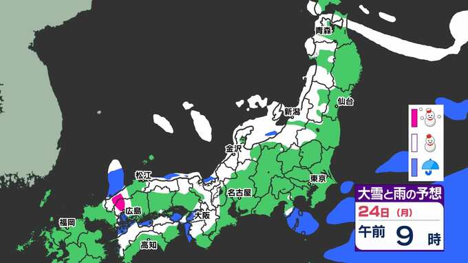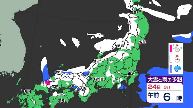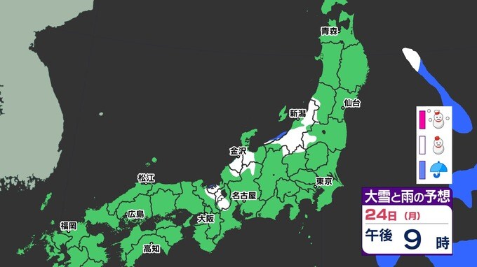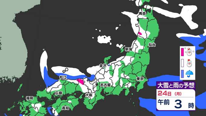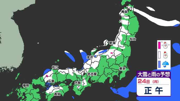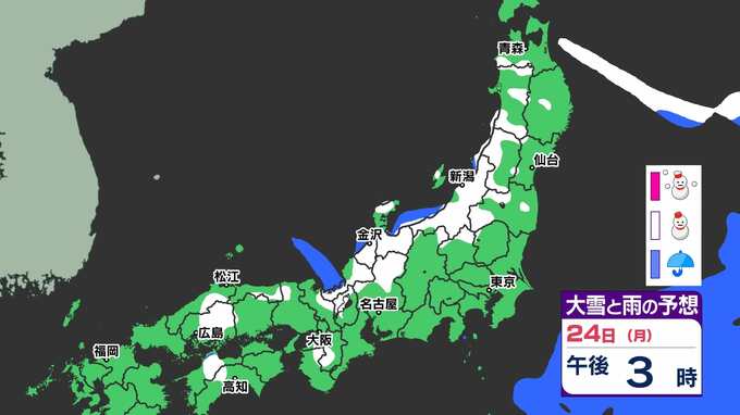 「赤」は「大雪」、「白」は「雪」、「青」は雨の予想