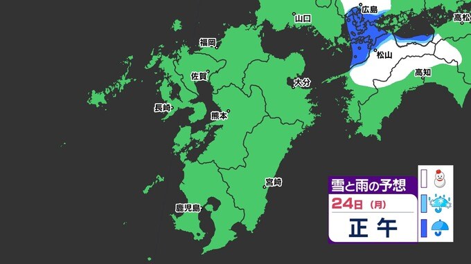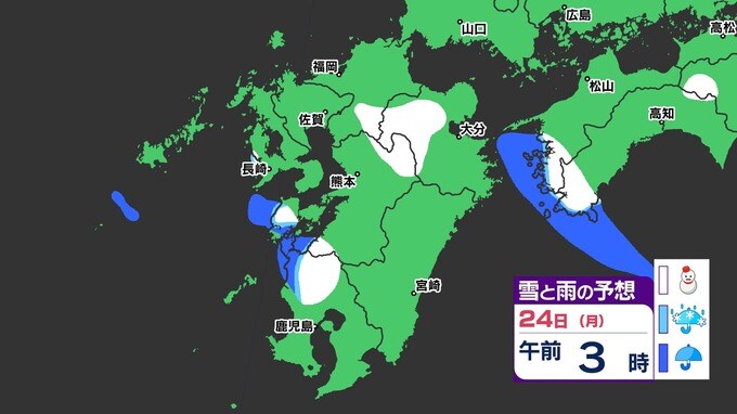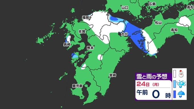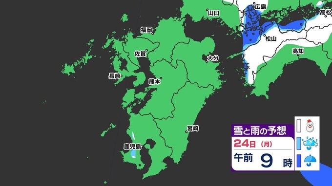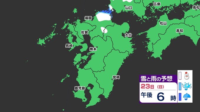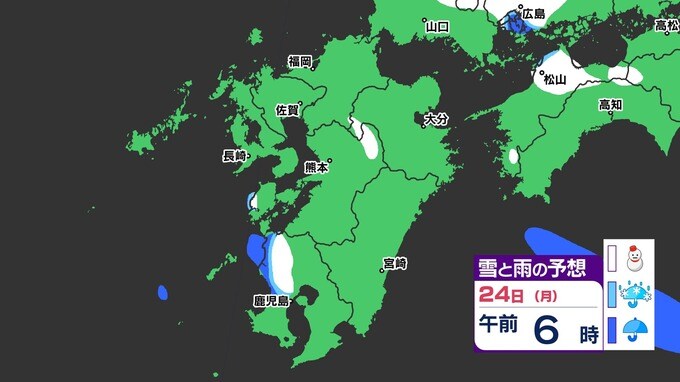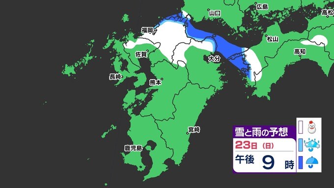 【3連休に雪の予報】寒いだけで終わらなかった 強烈寒気 福岡県に雪の予報 雪のシミュレーション 【雪はいつ どこで降る?】福岡・佐賀・長崎・大分・熊本・宮崎・鹿児島 2025年2月20日(木) 20:30 国内 天気 雪のシミュレーション23日(日祝)~24日(月振) 23日(日祝)夕方から福岡県で降りはじめ、夜が雪のピークとなりそうです。24日(月振)朝は、鹿児島県でも雪が予想されています。画像で確認できます。 『白』=『雪』/『水色』=『みぞれ(雨と雪が混ざったもの)』/『青』=『雨』の予想