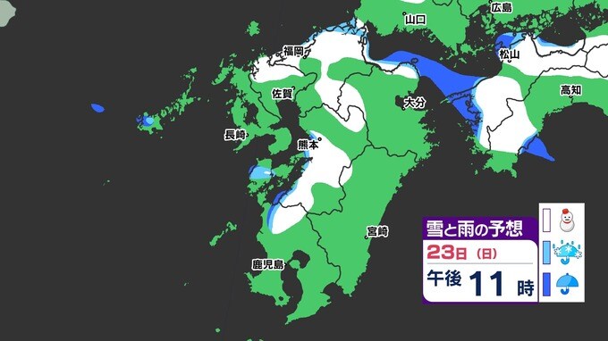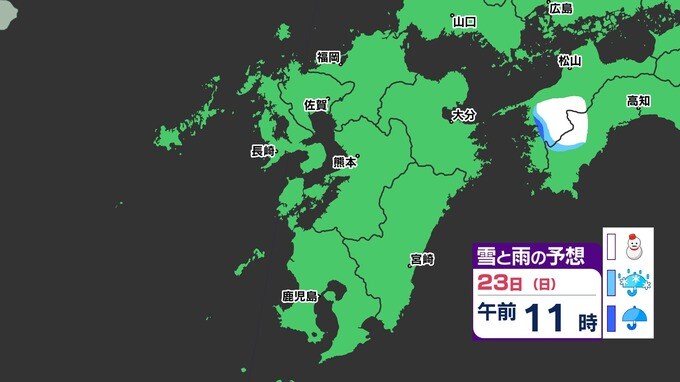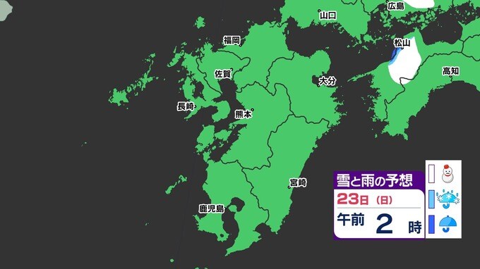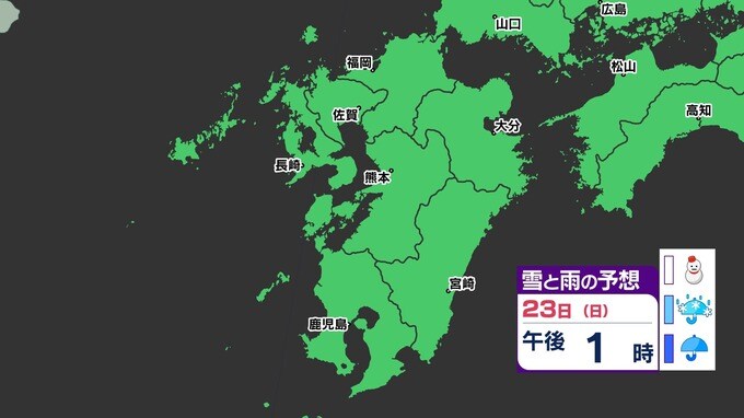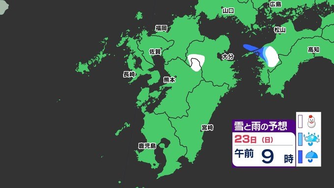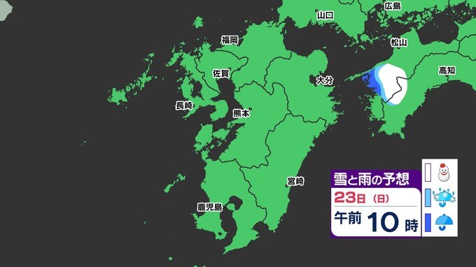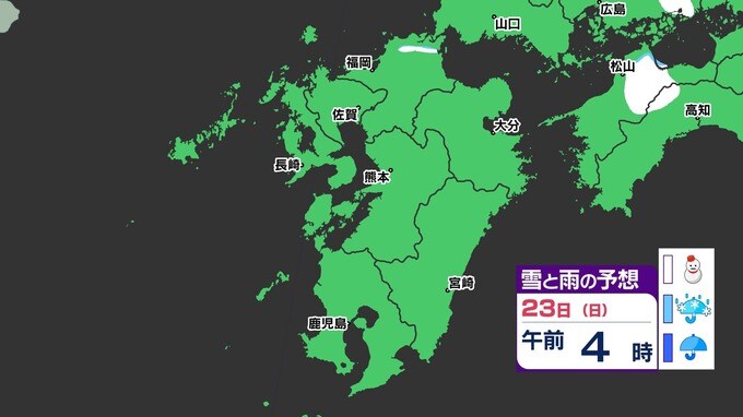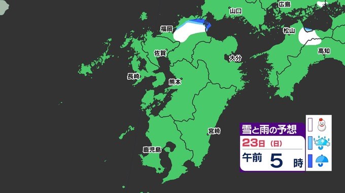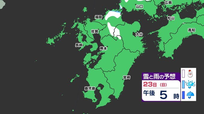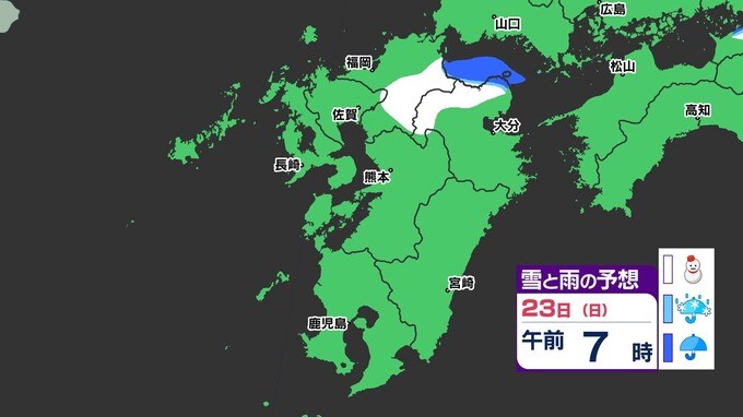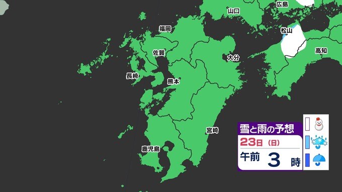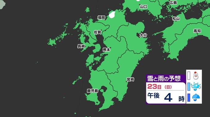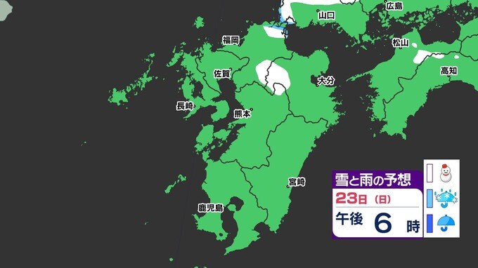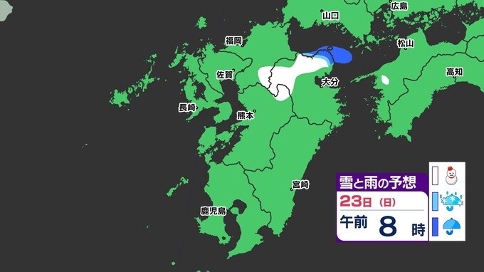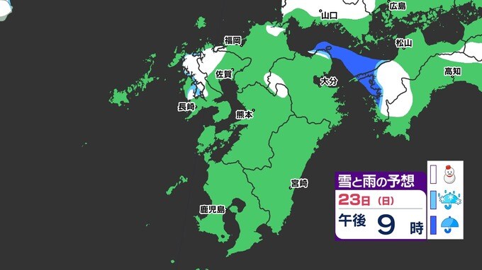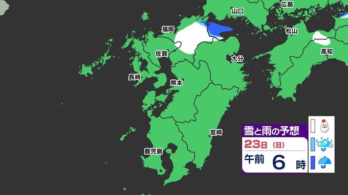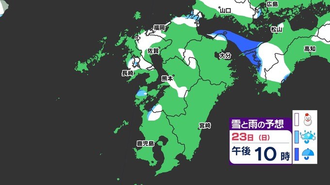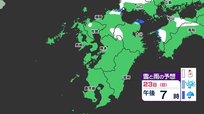 【3連休 大雪情報】福岡県山地5cm 平地1cm 最長寒波 寒さだけでは終わらなかった【雪はいつ どこで降る?】 雪のシミュレーション23日(日祝)~24(月振) 福岡・佐賀・長崎・大分・熊本・宮崎・鹿児島 2025年2月21日(金) 20:00 国内 天気 【九州】雪のシミュレーション23日(日祝)~24日(月振) 23日(日祝)明け方から朝、福岡県と大分県に雪の予想が出てきます。23日(日祝)夜には、福岡県・大分県だけでなく、佐賀県・長崎県・熊本県・鹿児島県にも雪の予想が広がり、24日(月振)朝まで雪の予想が続きます。 『白』=『雪』/『水色』=『みぞれ(雨と雪が混ざったもの)』/『青』=『雨』の予想