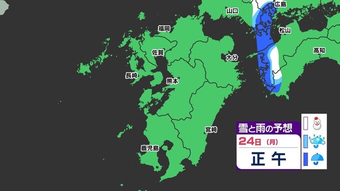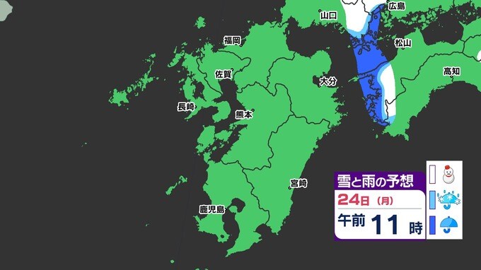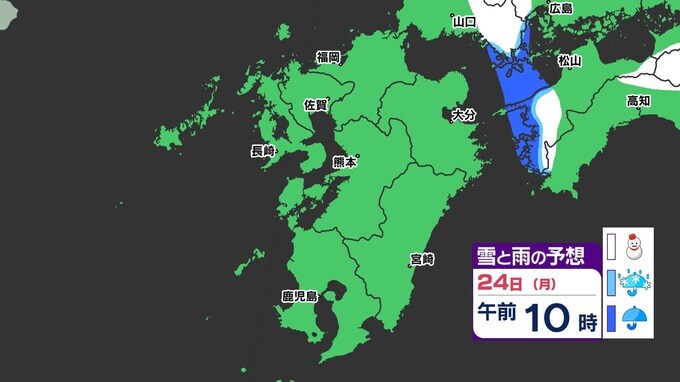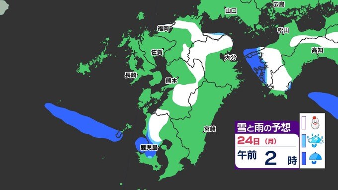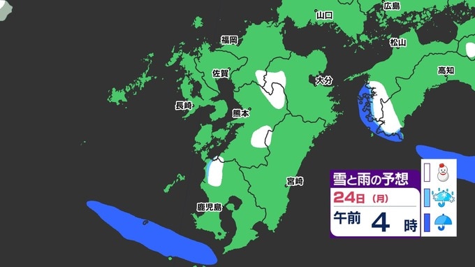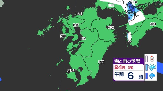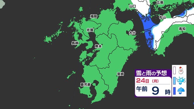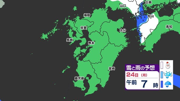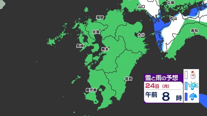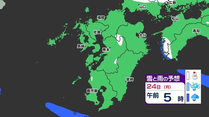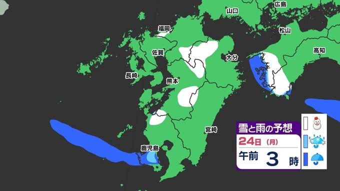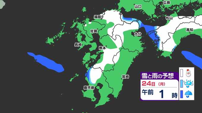 【3連休 大雪情報】福岡県山地5cm 平地1cm 最長寒波 寒さだけでは終わらなかった【雪はいつ どこで降る?】 雪のシミュレーション23日(日祝)~24(月振) 福岡・佐賀・長崎・大分・熊本・宮崎・鹿児島 2025年2月21日(金) 20:00 国内 天気 『白』=『雪』/『水色』=『みぞれ(雨と雪が混ざったもの)』/『青』=『雨』の予想