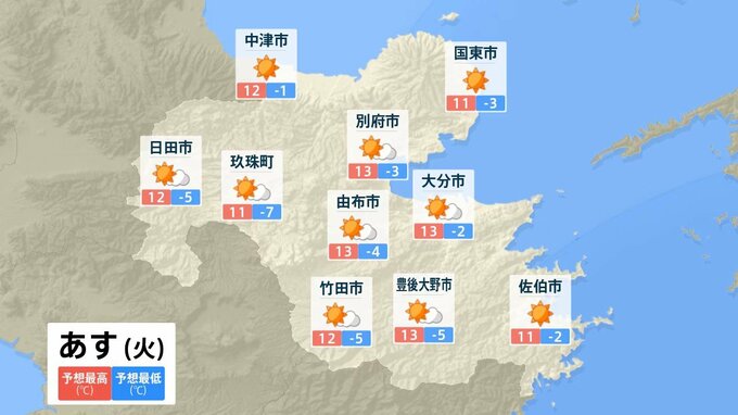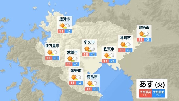 【低温注意報】 25日(火)朝 冷え込み強まる 福岡市0℃ 熊本市-3℃ 鹿児島市-1℃ 路面凍結 水道管凍結 に注意【福岡・佐賀・長崎・大分・熊本・宮崎・鹿児島】あす朝最低気温 & 週間予報/寒気と暖気のシミュレーション 2025年2月24日(月) 19:30 国内 天気 25日(火)天気予報 九州各地の25日(火)の天気予報、予想される最低気温や最高気温です。 25日(火)は朝の冷え込みが厳しいですが、日中の寒さは和らぐでしょう。 〈福岡県〉宗像市・朝倉市の予想最低気温は-4℃ 〈佐賀県〉多久市・武雄市・嬉野市の予想最低気温は-4℃ 〈長崎県〉島原市の予想最低気温は-2℃ 〈大分県〉玖珠町の予想最低気温は九州で最も低い-7℃ 〈熊本県〉山鹿市・阿蘇市・山都町の予想最低気温は-6℃ 〈宮崎県〉高千穂町・美郷町の予想最低気温は-5℃ 〈鹿児島県〉薩摩川内市・鹿屋市の予想最低気温は-4℃