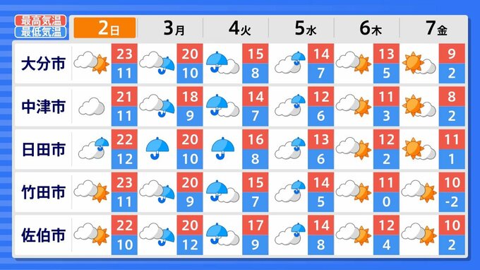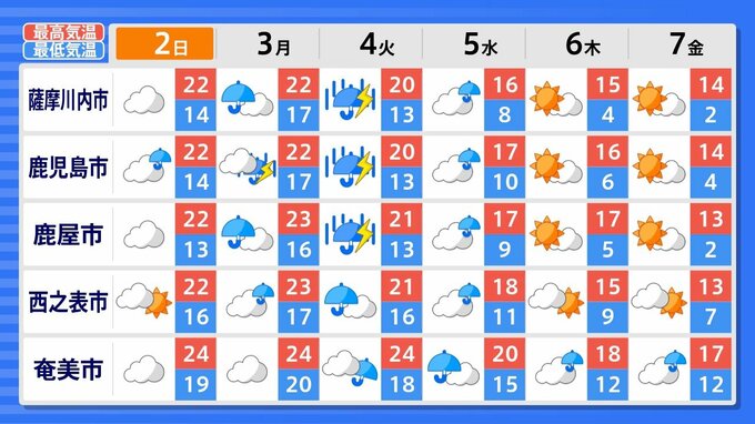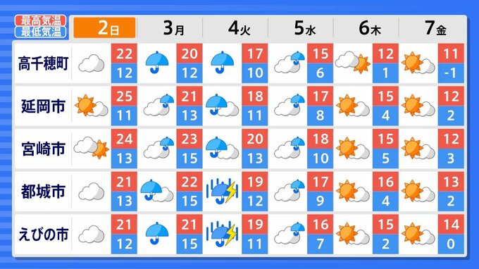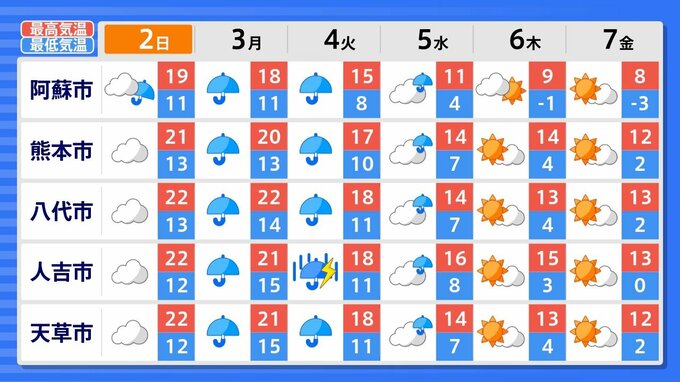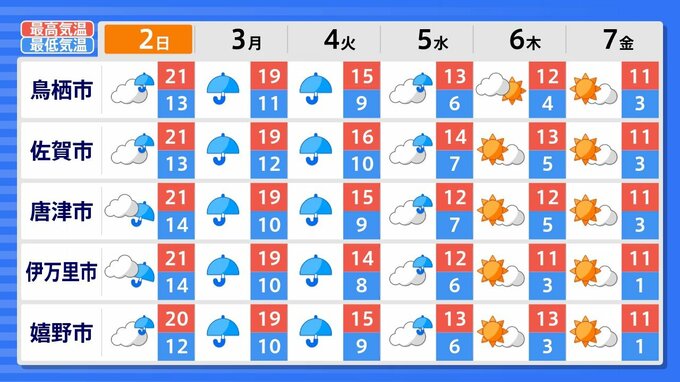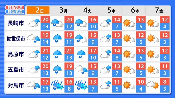 【日曜は雨】 土日暖かい 来週冷たい雨 寒の戻り 雪の心配は?【福岡・佐賀・長崎・大分・熊本・宮崎・鹿児島】雨と雪のシミュレーション3月2日(日)~5日(水)&週間予報 2025年2月28日(金) 20:45 国内 天気 3月2日(日)~7日(金)週間予報 『福岡県・佐賀県・長崎県・大分県・熊本県・宮崎県・鹿児島県』の週間予報を画像で掲載しています。 3月4日(火)は低気圧が九州を通過する見込みで、雨風強く〈荒れた天気〉になるおそれがあります。 〈福岡県〉3月2日(日)から雨、 7日(金)北九州市の最高気温9℃ 〈佐賀県〉3月2日(日)から雨、 7日(金)佐賀市の最高気温11℃ 〈長崎県〉3月2日(日)から雨、 3日(月)4日(火)対馬市は荒れ模様 〈大分県〉3月3日(月)から雨、 7日(金)大分市の最高気温9℃ 〈熊本県〉3月3日(月)から雨、 4日(火)人吉市は荒れ模様 〈宮崎県〉3月3日(月)から雨、 4日(火)都城市・えびの市は荒れ模様 〈鹿児島県〉3月3日(月)から雨、 4日(火)薩摩川内市・鹿児島市・鹿屋市は荒れ模様