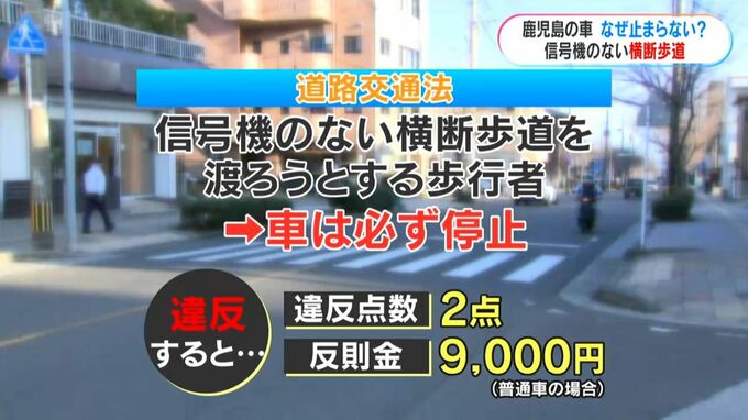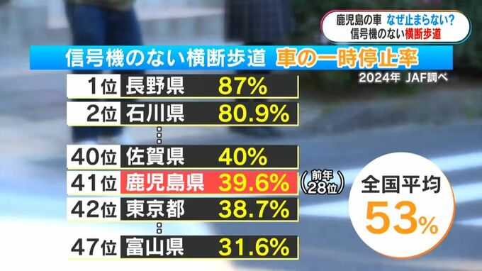 JAFが、全国の信号のない横断歩道で車の停止率を調べた結果、去年、鹿児島県は、全国で41位の39.6%。全国平均の53%を13ポイント余り下回りました。前の年の28位からさらに順位を13位下げ、九州・沖縄では最も低い結果です。