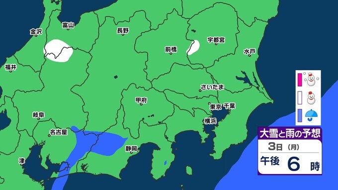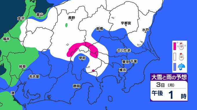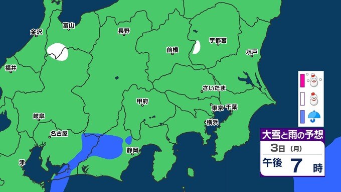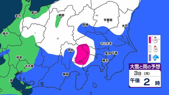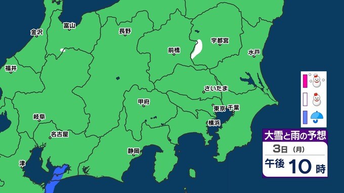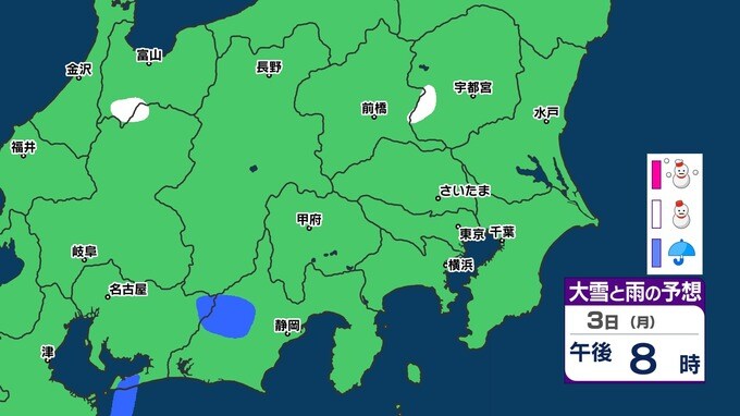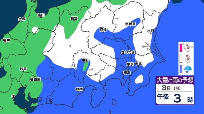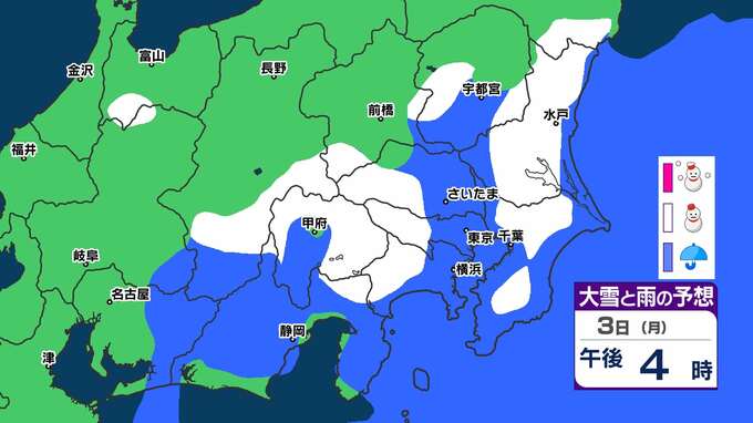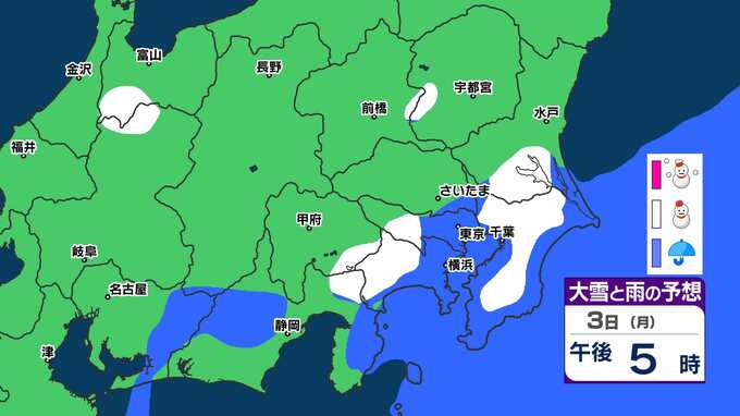 【大雪情報】東京都心も雪 23区1cm 多摩5cm【東京・神奈川・埼玉・千葉の雪の予報を詳しく】雪のシミュレーション3月3日(月)~5日(水)/ 雪はいつから 大雪はどこで? 2025年3月3日(月) 13:00 国内 天気 雪のシミュレーション3月3日(月)~5日(水) 3日(月)冷たい雨か雪が続き、夜には止みそうです。 4日(火)日中は小康状態、夜になると再び雪になりそうです。 5日(水)朝にかけて東京都心は雪になそうです。朝は積雪のおそれがあります。 画像で確認できます。 「赤」は「大雪」、「白」は「雪」、「青」は雨の予想
