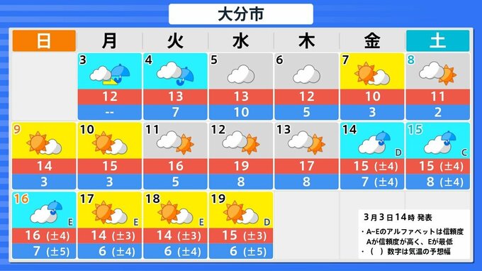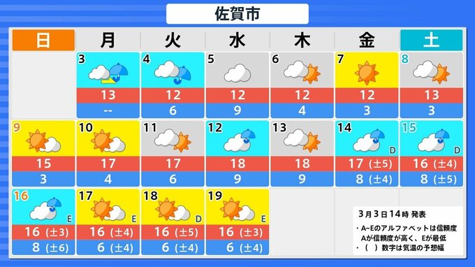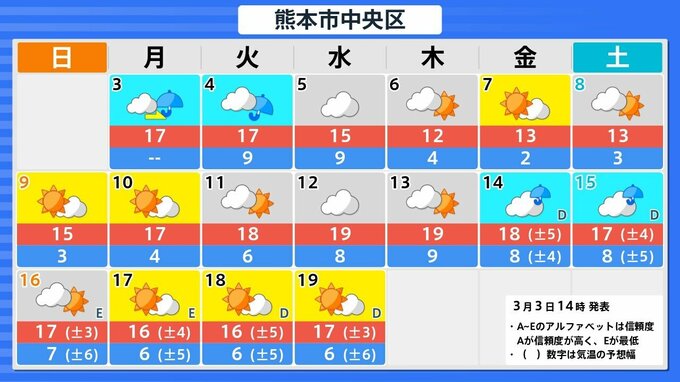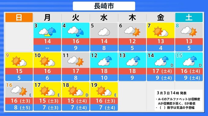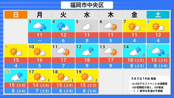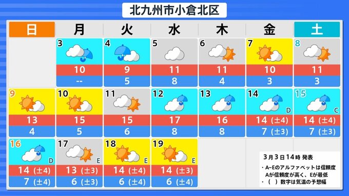 【早期天候情報】来週 九州沖縄は気温高め 汗ばむ陽気? 気象庁の予想詳しく【福岡市・北九州市・熊本市・佐賀市・長崎市・大分市・宮崎市・鹿児島市・那覇市】の16日間予想 2025年3月3日(月) 20:00 国内 天気 早期天候情報の詳細&16日間予報 『早期天候情報』の詳細は画像で確認できます。 なお、福岡市・北九州市・佐賀市・長崎市・大分市・熊本市・宮崎市・鹿児島市・那覇市の16日間予報では、来週の〈最低気温と最高気温の予想〉が掲載されています。