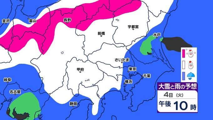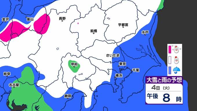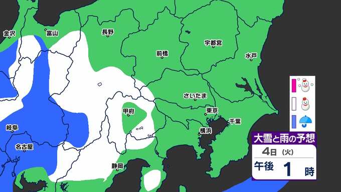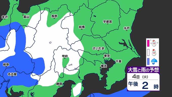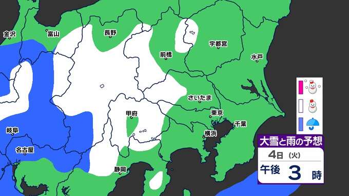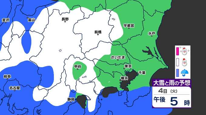 【大雪情報】東京都心 雪の予想 23区1cm 多摩10cm 多摩地区の予想降雪量さらに増える【東京・神奈川・埼玉・千葉の雪の予報を詳しく】雪のシミュレーション3月3日(月)~5日(水)/ 雪はいつまで 大雪はどこで? 2025年3月3日(月) 20:00 国内 天気 「赤」は「大雪」、「白」は「雪」、「青」は雨の予想
