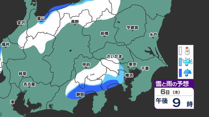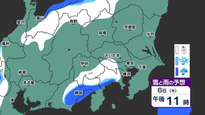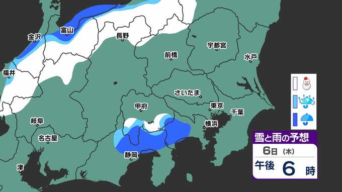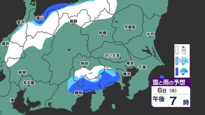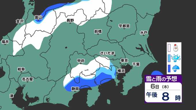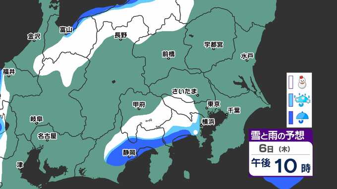 【東京 また雪か?】東京 首都圏 雪のシミュレーション6日(木)7日(金) 道路凍結注意【東京・神奈川・埼玉・千葉・山梨・群馬・栃木・茨城】 2025年3月6日(木) 13:00 国内 天気 雪のシミュレーション3月6日(木)~7日(金) 6日(木)多摩地区を中心に、夜は冷たい雨か雪になりそうです。 画像で確認できます。 『白』=『雪』/『水色』=『みぞれ(雨と雪が混ざったもの)』/『青』=『雨』の予想