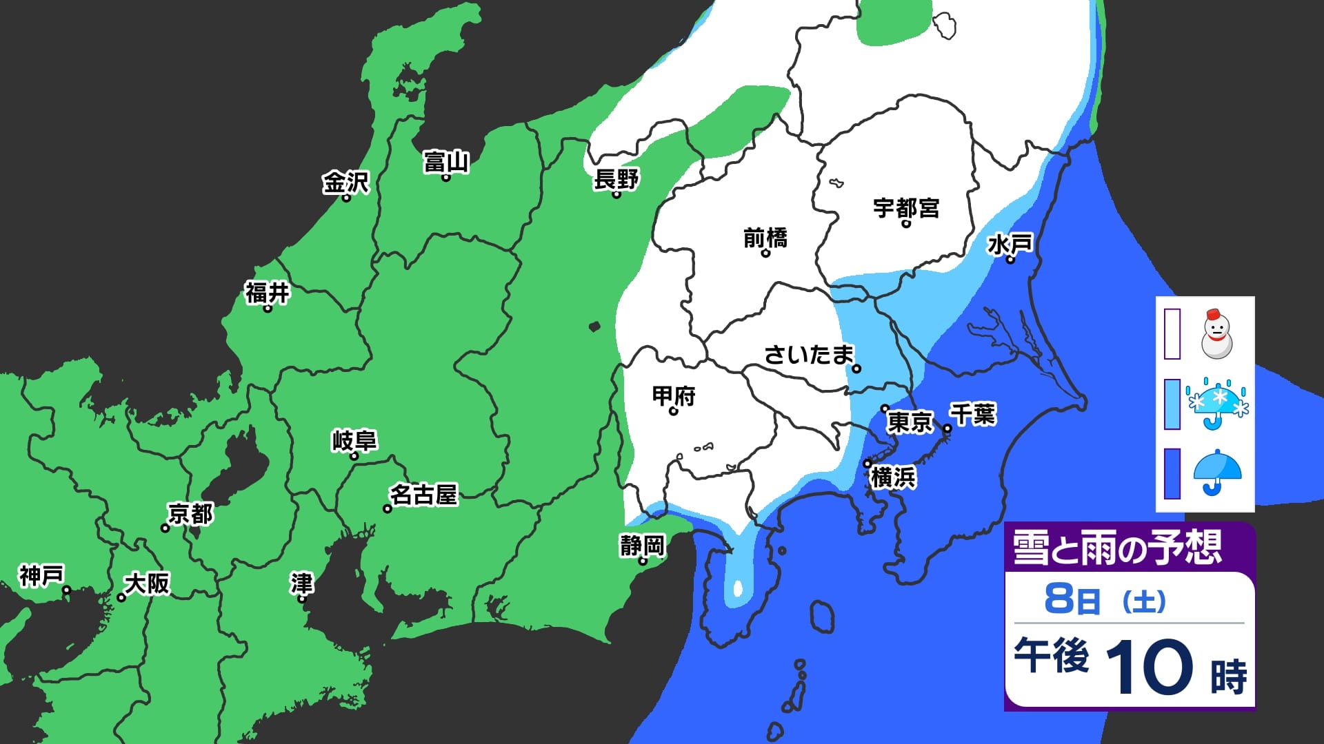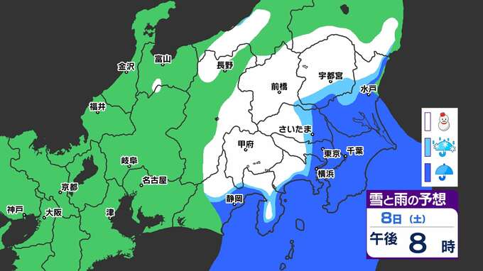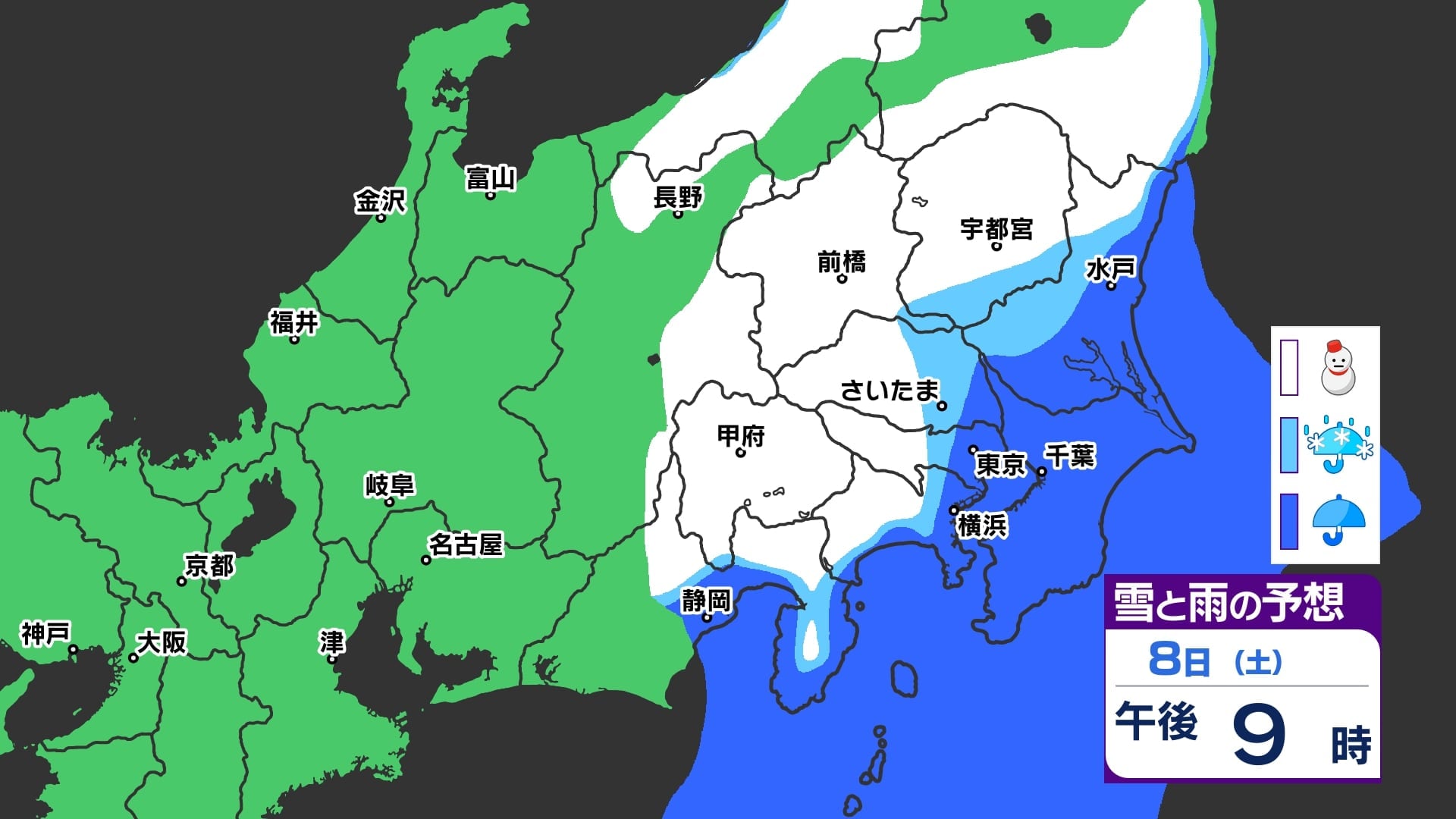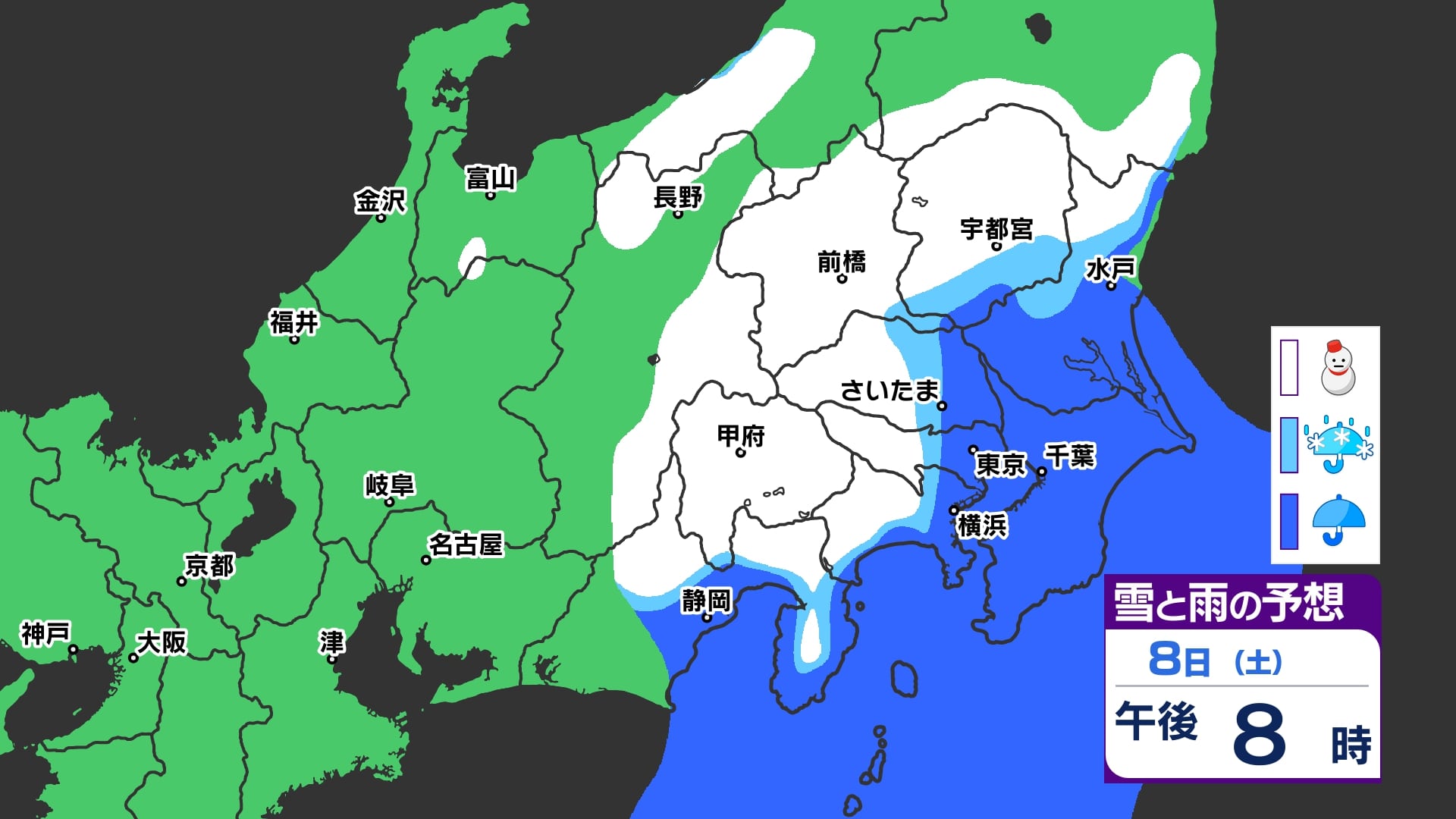 【大雪情報】東京・神奈川・埼玉・千葉・群馬・栃木・茨城・山梨 気象台発表を詳しく【雪のシミュレーション8日(土)~9日(日)】 2025年3月7日(金) 21:00 国内 天気 雪のシミュレーション8日(土)~9日(日) 8日(土)夕方から《冷たい雨》や《雪》が降りそうです。交通への影響があるかもしれません。画像で確認できます。 『白』=『雪』/『水色』=『みぞれ(雨と雪が混ざったもの)』/『青』=『雨』の予想