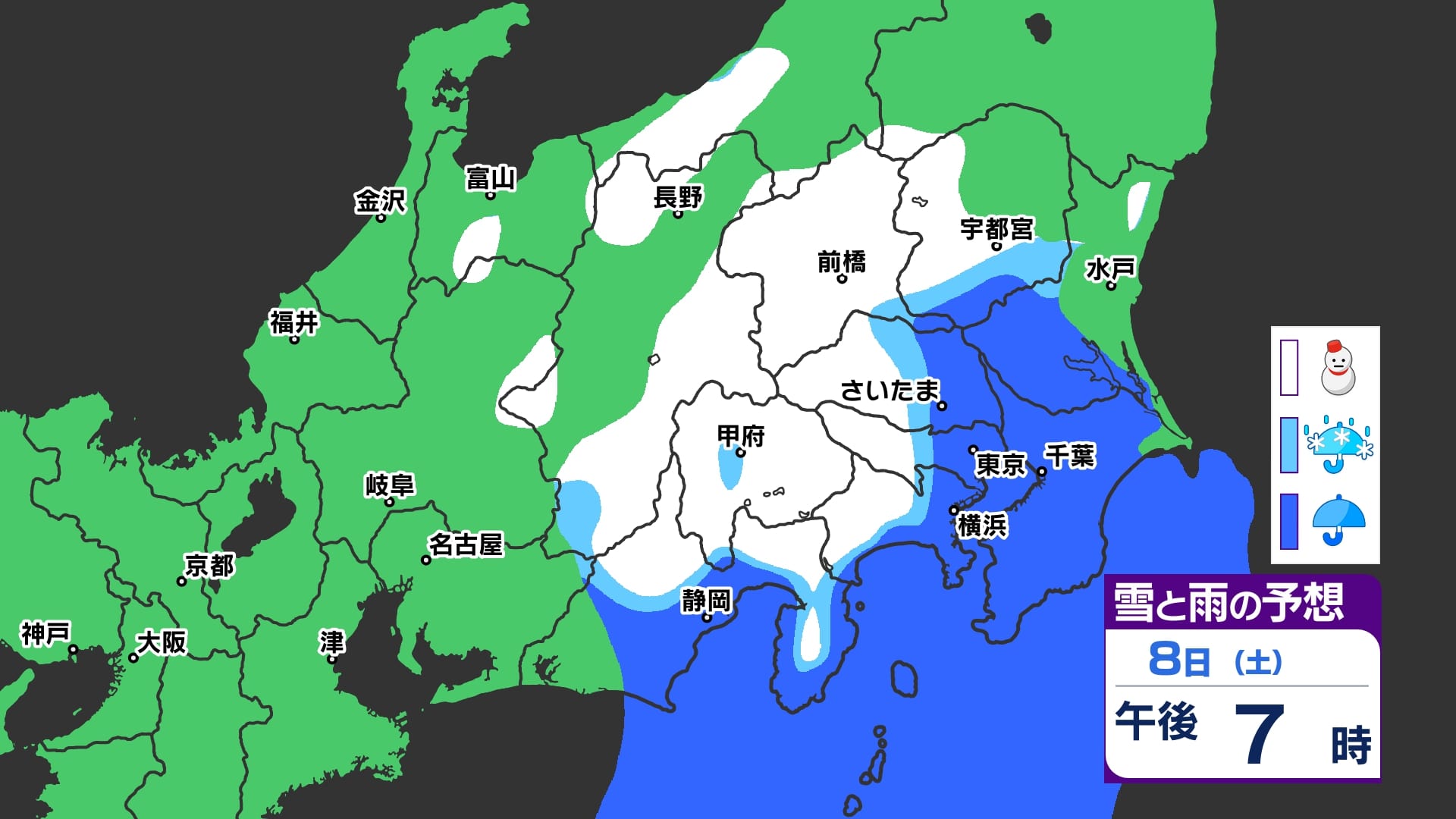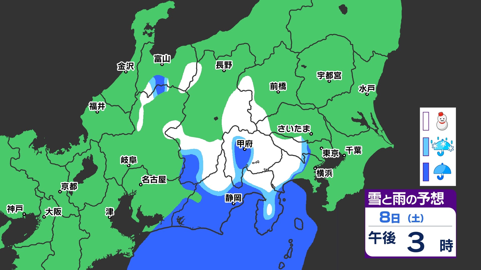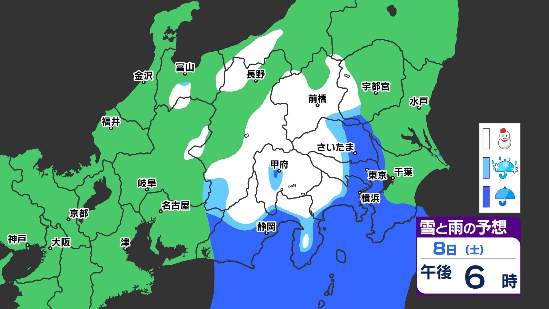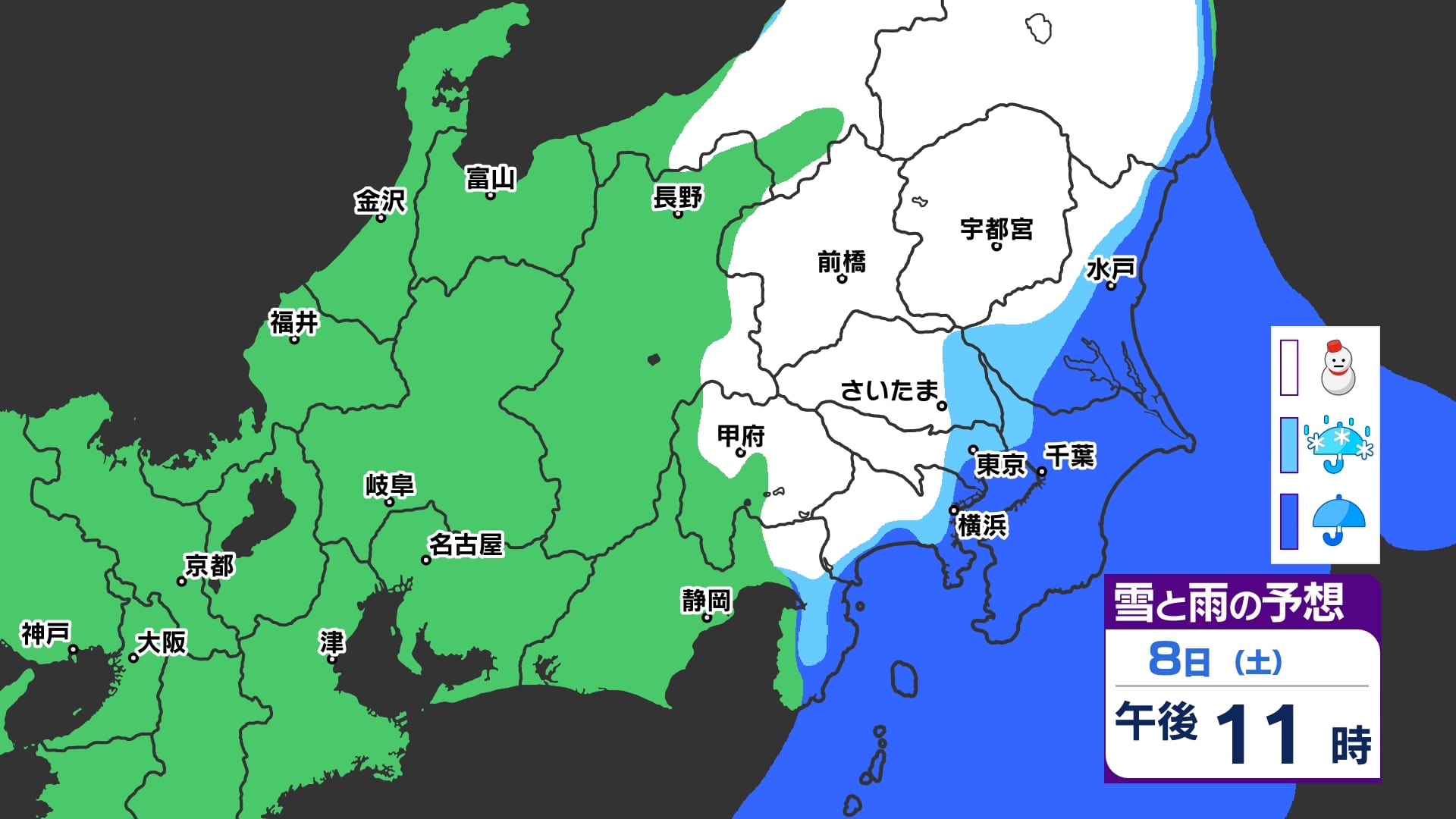 【大雪情報】東京・神奈川・埼玉・千葉・群馬・栃木・茨城・山梨 気象台発表を詳しく【雪のシミュレーション8日(土)~9日(日)】 2025年3月7日(金) 21:00 国内 天気 雪のシミュレーション8日(土)~9日(日) 8日(土)夕方から《冷たい雨》や《雪》が降りそうです。交通への影響があるかもしれません。画像で確認できます。 『白』=『雪』/『水色』=『みぞれ(雨と雪が混ざったもの)』/『青』=『雨』の予想