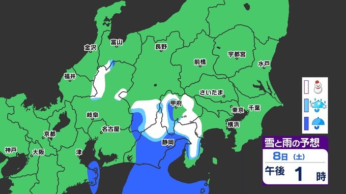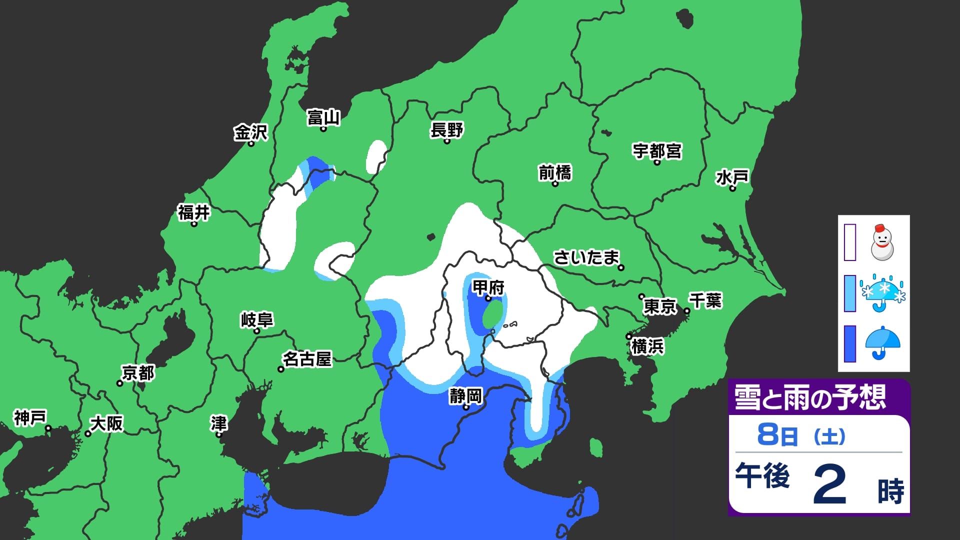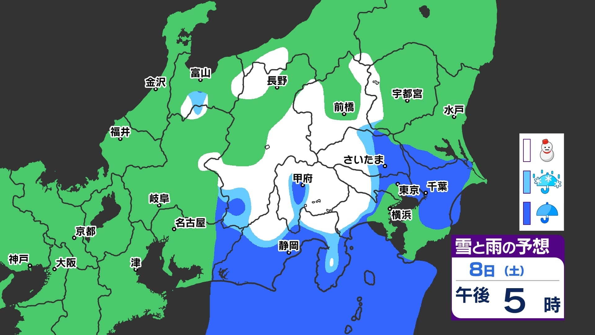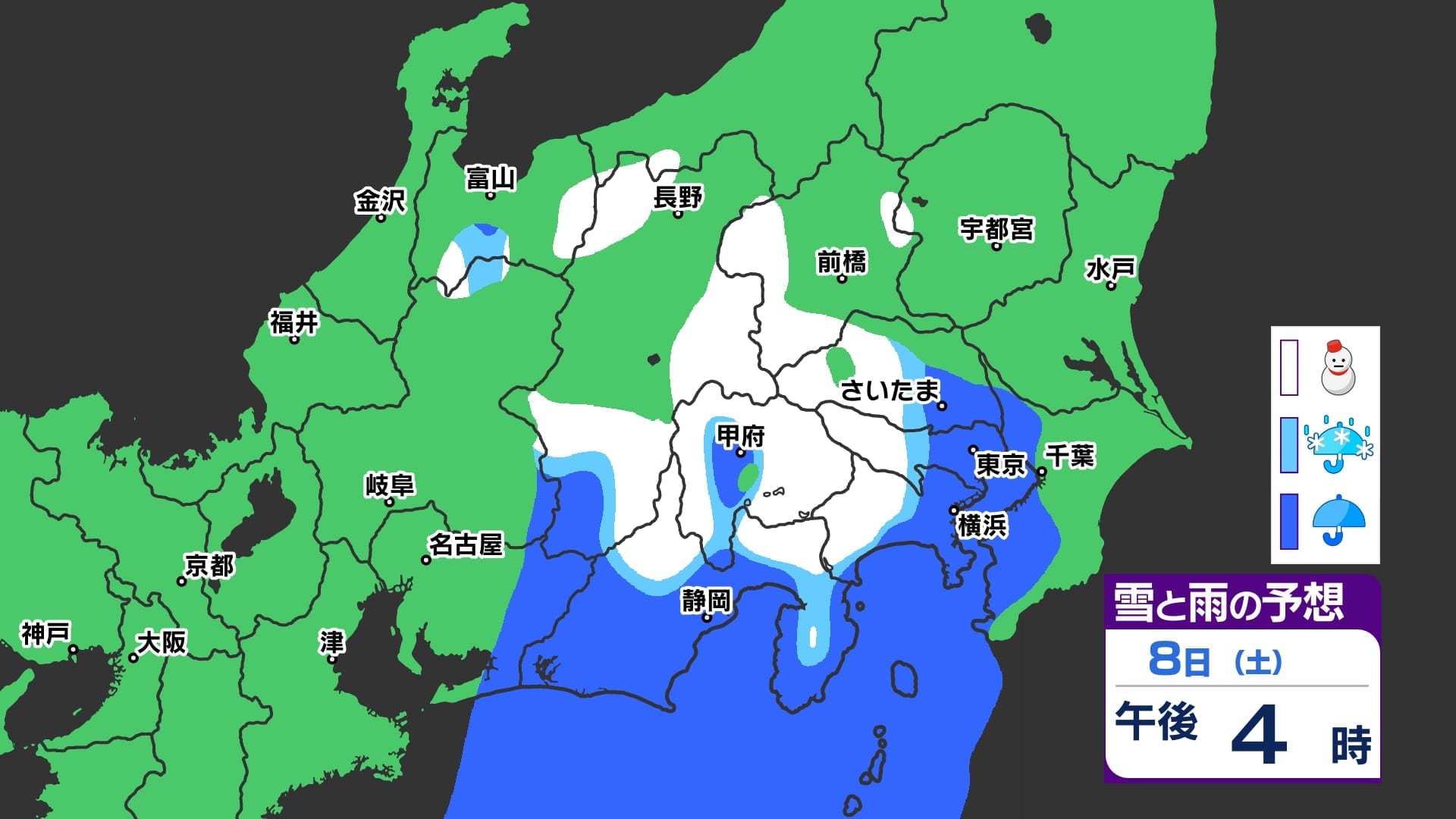 【大雪情報】東京・神奈川・埼玉・千葉・群馬・栃木・茨城・山梨 気象台発表を詳しく【雪のシミュレーション8日(土)~9日(日)】 2025年3月7日(金) 21:00 国内 天気 雪のシミュレーション8日(土)~9日(日) 8日(土)夕方から《冷たい雨》や《雪》が降りそうです。交通への影響があるかもしれません。画像で確認できます。 『白』=『雪』/『水色』=『みぞれ(雨と雪が混ざったもの)』/『青』=『雨』の予想